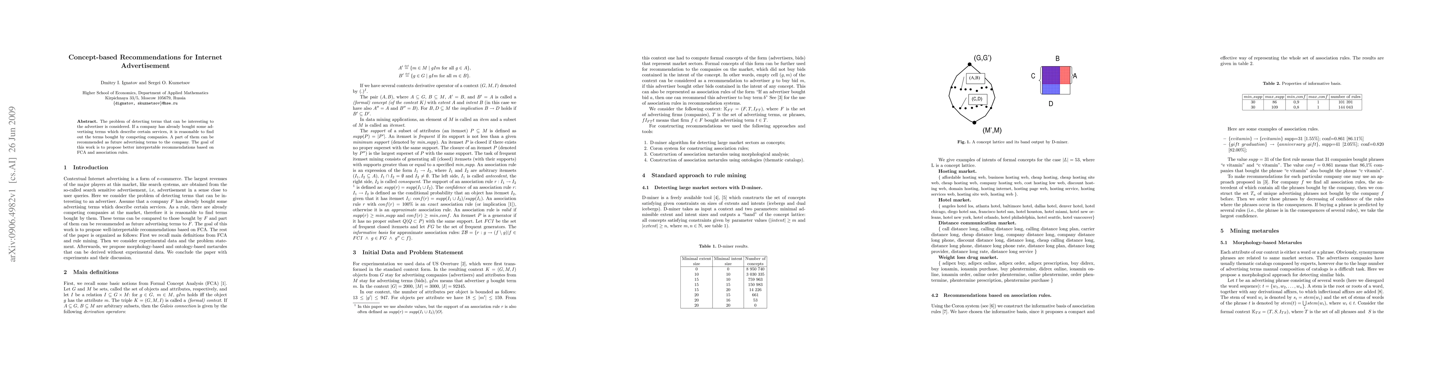 The problem of detecting terms that can be interesting to the advertiser is considered. If a company has already bought some advertising terms which describe certain services, it is reasonable to find out the terms bought by competing companies. A part of them can be recommended as future advertising terms to the company. The goal of this work is to propose better interpretable recommendations based on FCA and association rules.
