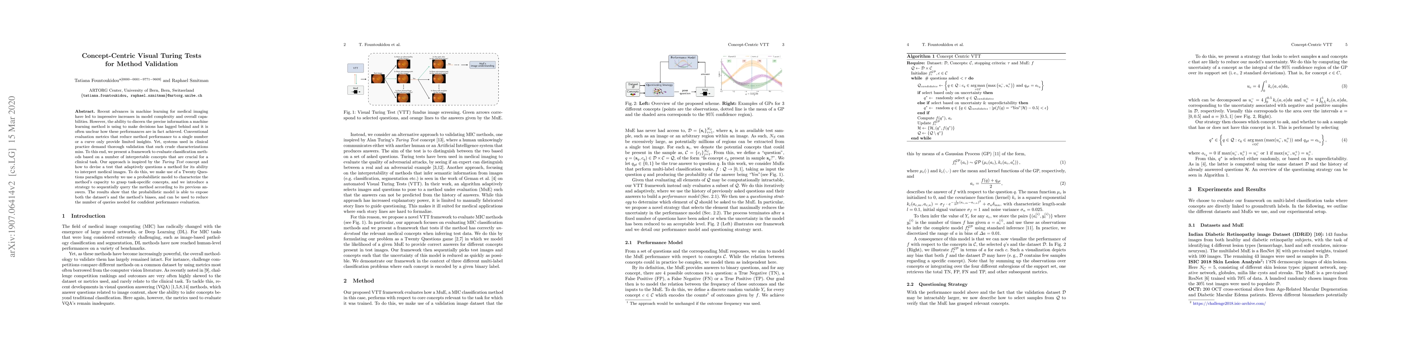 Recent advances in machine learning for medical imaging have led to impressive increases in model complexity and overall capabilities. However, the ability to discern the precise information a machine learning method is using to make decisions has lagged behind and it is often unclear how these performances are in fact achieved. Conventional evaluation metrics that reduce method performance to a single number or a curve only provide limited insights. Yet, systems used in clinical practice demand thorough validation that such crude characterizations miss. To this end, we present a framework to evaluate classification methods based on a number of interpretable concepts that are crucial for a clinical task. Our approach is inspired by the Turing Test concept and how to devise a test that adaptively questions a method for its ability to interpret medical images. To do this, we make use of a Twenty Questions paradigm whereby we use a probabilistic model to characterize the method's capacity to grasp task-specific concepts, and we introduce a strategy to sequentially query the method according to its previous answers. The results show that the probabilistic model is able to expose both the dataset's and the method's biases, and can be used to reduced the number of queries needed for confident performance evaluation.