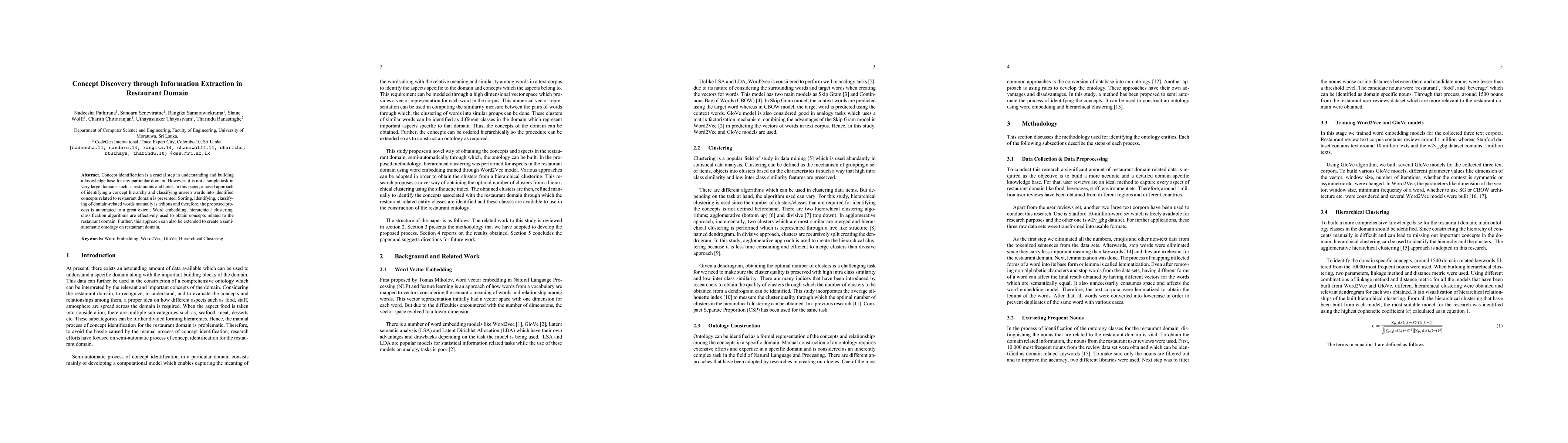 This paper presents an automated method for identifying concept hierarchies and classifying unseen words in the restaurant domain using word embedding, hierarchical clustering, and classification algorithms. The approach aims to streamline the tedious manual process of sorting and classifying domain-related words, potentially facilitating the creation of a semi-automatic ontology.