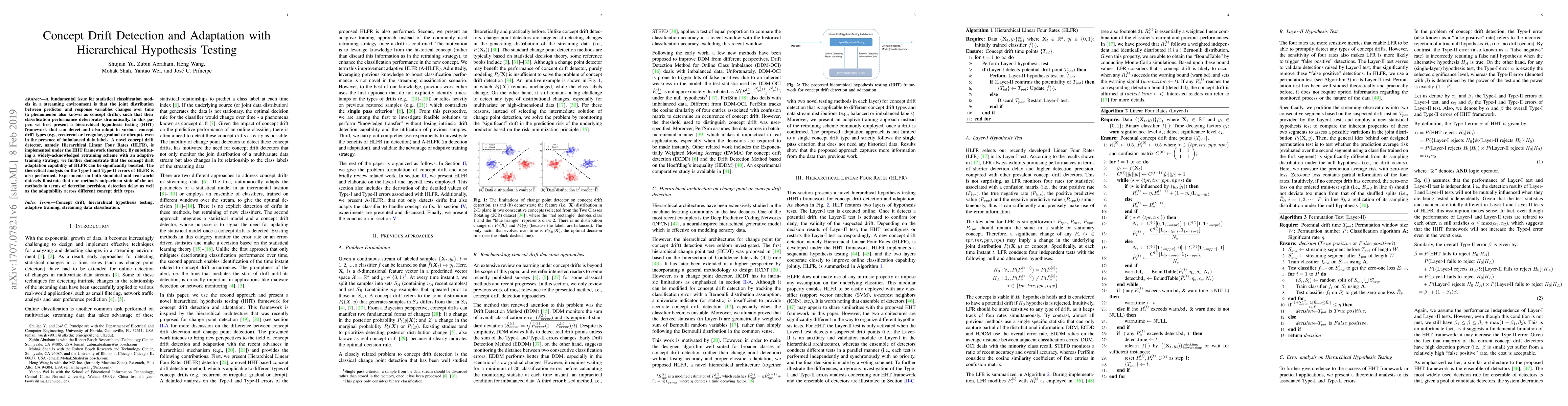 This paper introduces a hierarchical hypothesis testing framework for detecting and adapting to concept drift in streaming classification models, employing a novel Hierarchical Linear Four Rates detector (HLFR) and an adaptive training strategy to outperform existing methods in precision, delay, and adaptability. Theoretical analysis and experiments validate the effectiveness of the proposed approach.