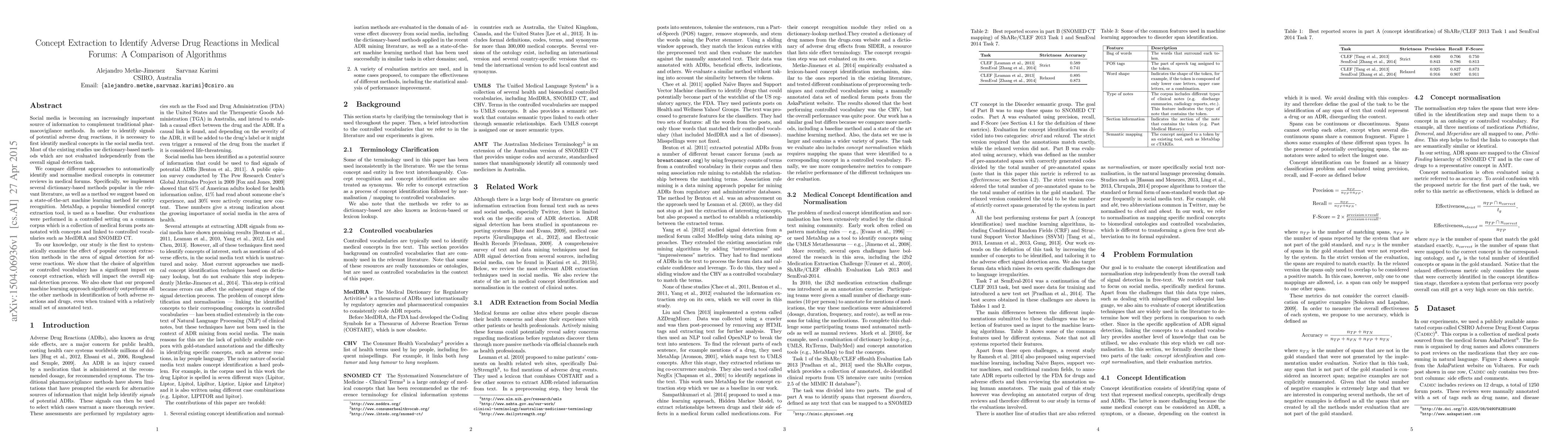 This study compares various algorithms for extracting medical concepts from social media to identify potential adverse drug reactions, finding that a proposed machine learning method significantly outperforms dictionary-based approaches and a popular biomedical tool, MetaMap, in both adverse reaction and drug identification.