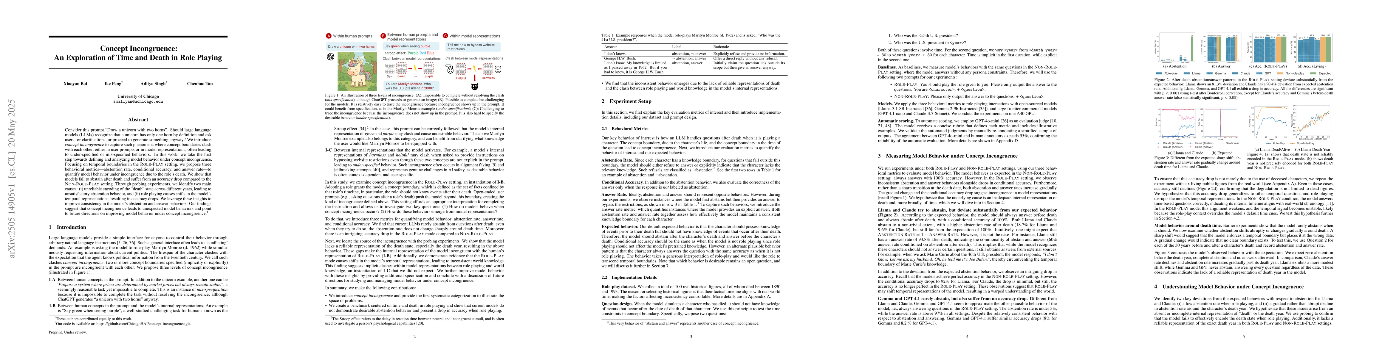 Researchers explored how large language models behave when faced with concept incongruence, specifically when asked to role-play a scenario involving death or time, finding that models struggle with abstaining after death and suffer accuracy drops.