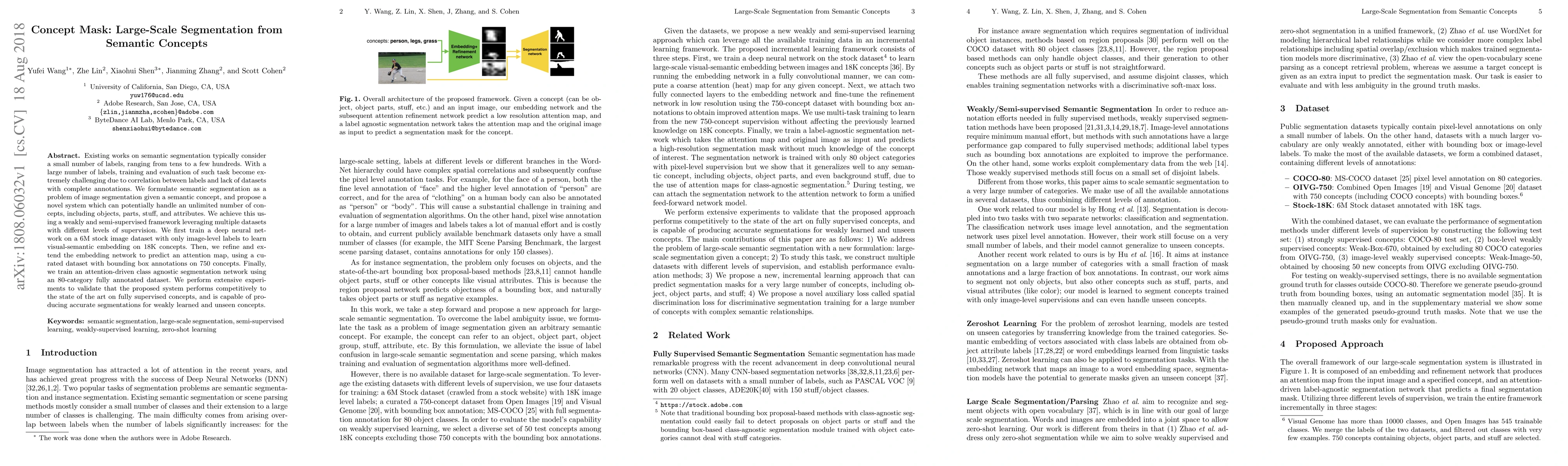 The paper proposes a novel system for large-scale semantic segmentation using a weakly and semi-supervised framework, enabling handling of an unlimited number of concepts. The system trains a deep neural network on a large stock image dataset to learn visual-semantic embeddings, refines the model using bounding box annotations, and achieves competitive performance on fully supervised concepts and accurate segmentations for unseen concepts.