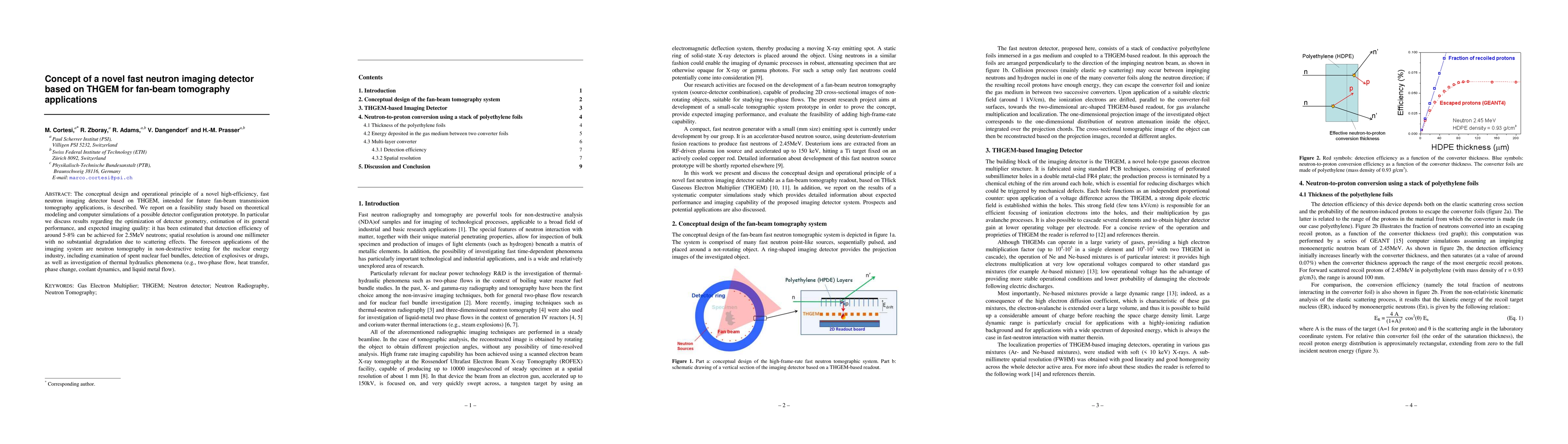 The conceptual design and operational principle of a novel high-efficiency, fast neutron imaging detector based on THGEM, intended for future fan-beam transmission tomography applications, is described. We report on a feasibility study based on theoretical modeling and computer simulations of a possible detector configuration prototype. In particular we discuss results regarding the optimization of detector geometry, estimation of its general performance, and expected imaging quality: it has been estimated that detection efficiency of around 5-8% can be achieved for 2.5MeV neutrons; spatial resolution is around one millimeter with no substantial degradation due to scattering effects. The foreseen applications of the imaging system are neutron tomography in non-destructive testing for the nuclear energy industry, including examination of spent nuclear fuel bundles, detection of explosives or drugs, as well as investigation of thermal hydraulics phenomena (e.g., two-phase flow, heat transfer, phase change, coolant dynamics, and liquid metal flow).