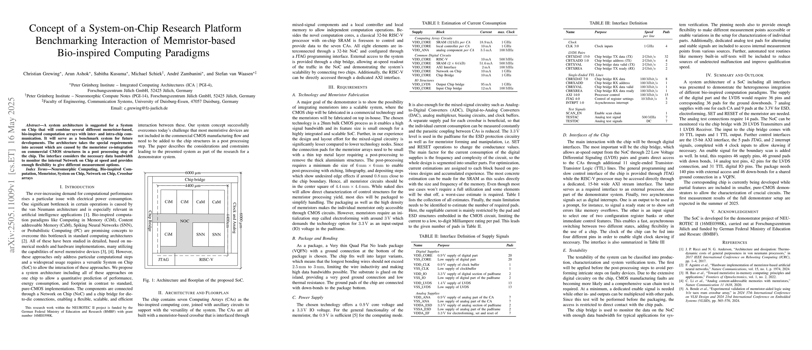 The paper suggests a system architecture for a System on Chip integrating various memristor-based, bio-inspired computation arrays with inter- and intra-chip communication, serving as a benchmark for future developments.
