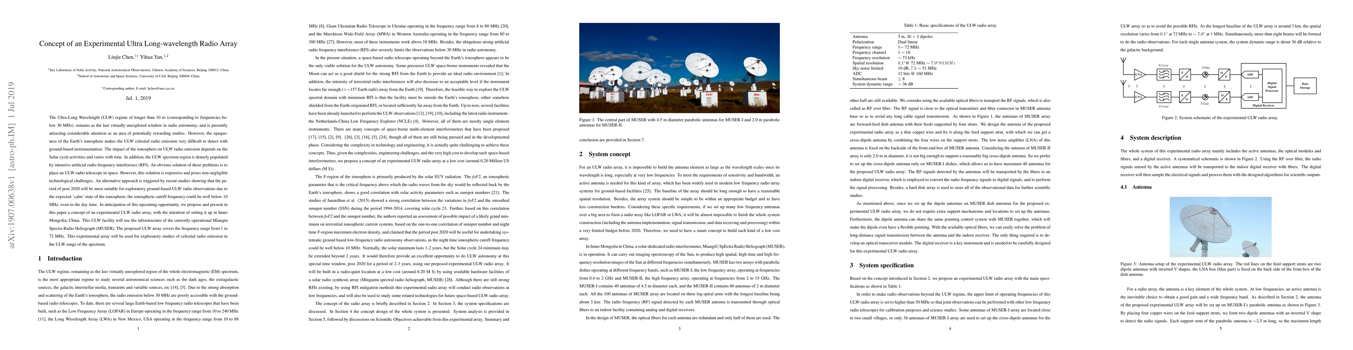The Ultra-Long Wavelength (ULW) regime of longer than 10 m (corresponding to frequencies below 30 MHz), remains as the last virtually unexplored window in radio astronomy, and is presently attracting considerable attention as an area of potentially rewarding studies. However, the opaqueness of the Earth's ionosphere makes the ULW celestial radio emission very difficult to detect with ground-based instrumentation. The impact of the ionosphere on ULW radio emission depends on the Solar cycle activities and varies with time. In addition, the ULW spectrum region is densely populated by intensive artificial radio frequency interference (RFI). An obvious solution of these problems is to place an ULW radio telescope in space. However, this solution is expensive and poses non-negligible technological challenges. An alternative approach is triggered by recent studies showing that the period of post 2020 will be most suitable for exploratory ground-based ULW radio observations due to the expected 'calm' state of the ionosphere; the ionospheric cutoff-frequency could be well below 10 MHz, even in the day time. In anticipation of this upcoming opportunity, we propose and present in this paper a concept of an experimental ULW radio array, with the intention of setting it up in Inner Mongolia, China. This ULW facility will use the infrastructure of the currently operational Miangtu Spectra Radio Heliograph (MUSER). The proposed ULW array covers the frequency range from 1 to 72 MHz. This experimental array will be used for exploratory studies of celestial radio emission in the ULW range of the spectrum.