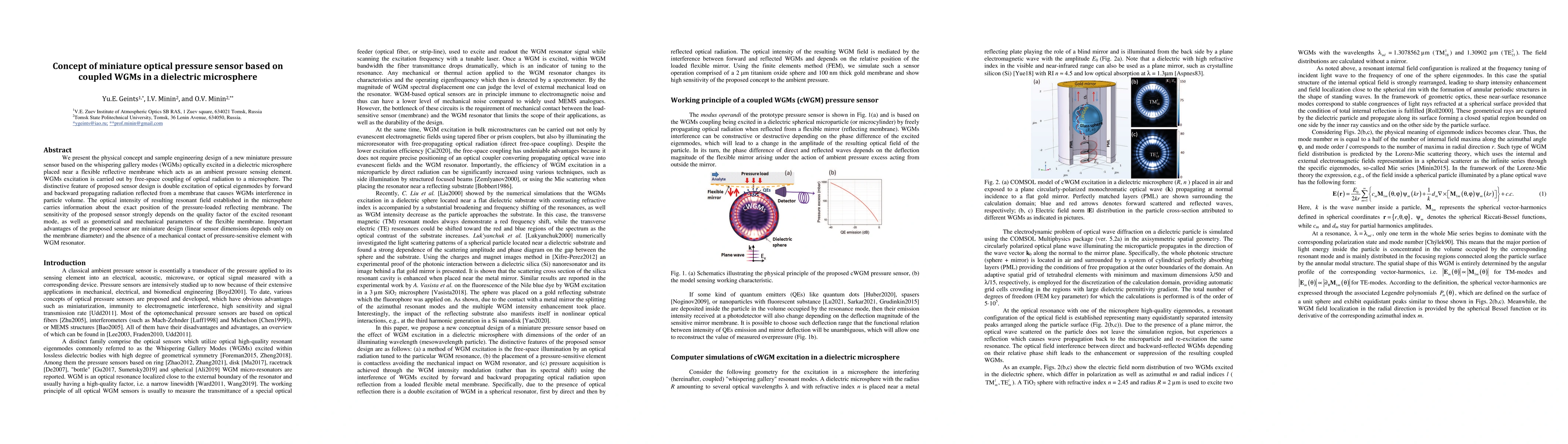 This research introduces a novel miniature optical pressure sensor based on whispering gallery modes (WGMs) excited in a dielectric microsphere near a flexible reflective membrane, utilizing double excitation and interference effects for pressure sensing. The design benefits from its small size and non-contact operation, with sensitivity depending on the resonator's quality factor and membrane parameters.