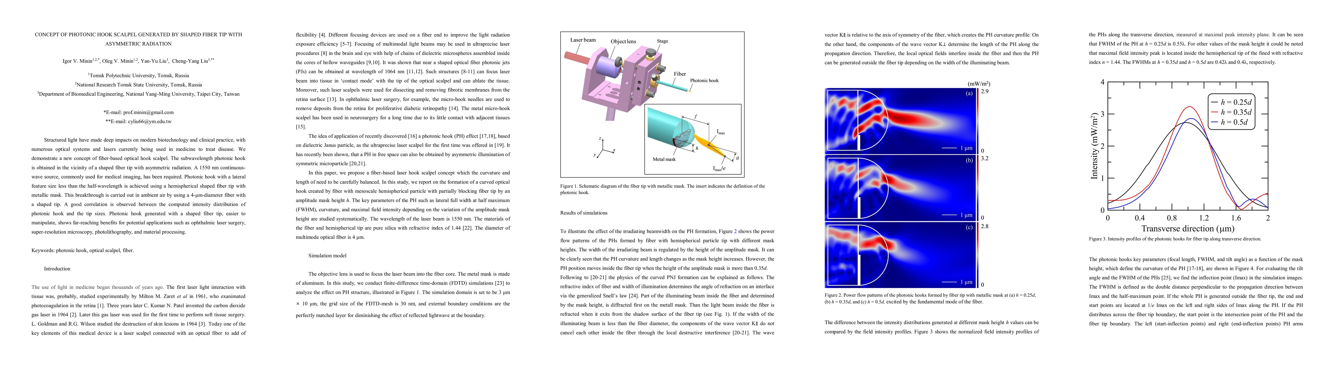 Structured light have made deep impacts on modern biotechnology and clinical practice, with numerous optical systems and lasers currently being used in medicine to treat disease. We demonstrate a new concept of fiber-based optical hook scalpel. The subwavelength photonic hook is obtained in the vicinity of a shaped fiber tip with asymmetric radiation. A 1550 nm continuous-wave source, commonly used for medical imaging, has been required. Photonic hook with a lateral feature size less than the half-wavelength is achieved using a hemispherical shaped fiber tip with metallic mask. This breakthrough is carried out in ambient air by using a 4-{\mu}m-diameter fiber with a shaped tip. A good correlation is observed between the computed intensity distribution of photonic hook and the tip sizes. Photonic hook generated with a shaped fiber tip, easier to manipulate, shows far-reaching benefits for potential applications such as ophthalmic laser surgery, super-resolution microscopy, photolithography, and material processing.