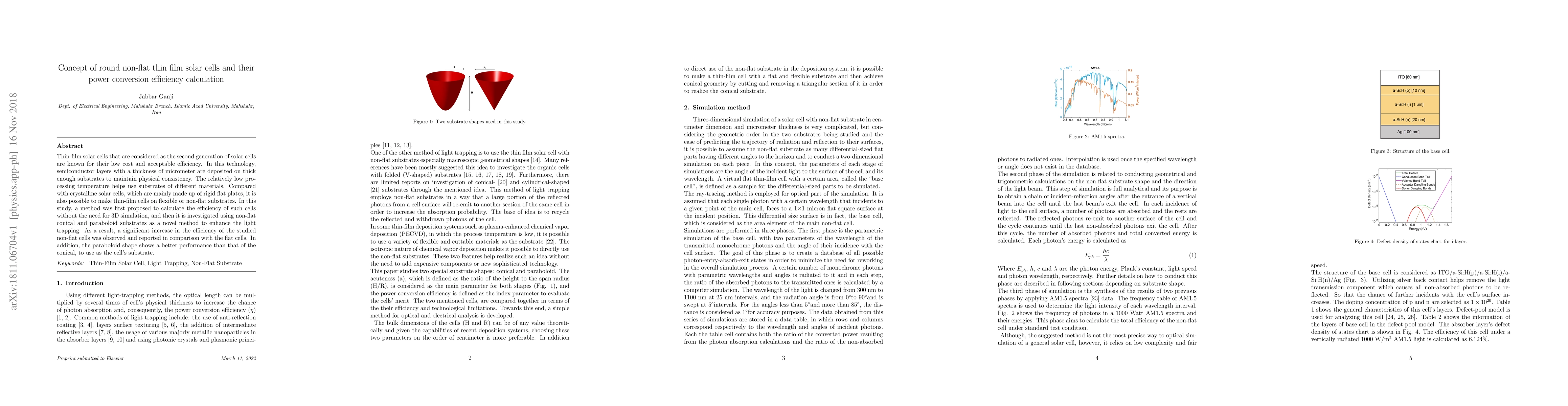 Thin-film solar cells that are considered as the second generation of solar cells are known for their low cost and acceptable efficiency. In this technology, semiconductor layers with a thickness of micrometer are deposited on thick enough substrates to maintain physical consistency. The relatively low processing temperature helps use substrates of different materials. Compared with crystalline solar cells, which are mainly made up of rigid flat plates, it is also possible to make thin-film cells on flexible or non-flat substrates. In this study, a method was first proposed to calculate the efficiency of such cells without the need for 3D simulation, and then it is investigated using non-flat conical and paraboloid substrates as a novel method to enhance the light trapping. As a result, a significant increase in the efficiency of the studied non-flat cells was observed and reported in comparison with the flat cells. In addition, the paraboloid shape shows a better performance than that of the conical, to use as the cell's substrate.