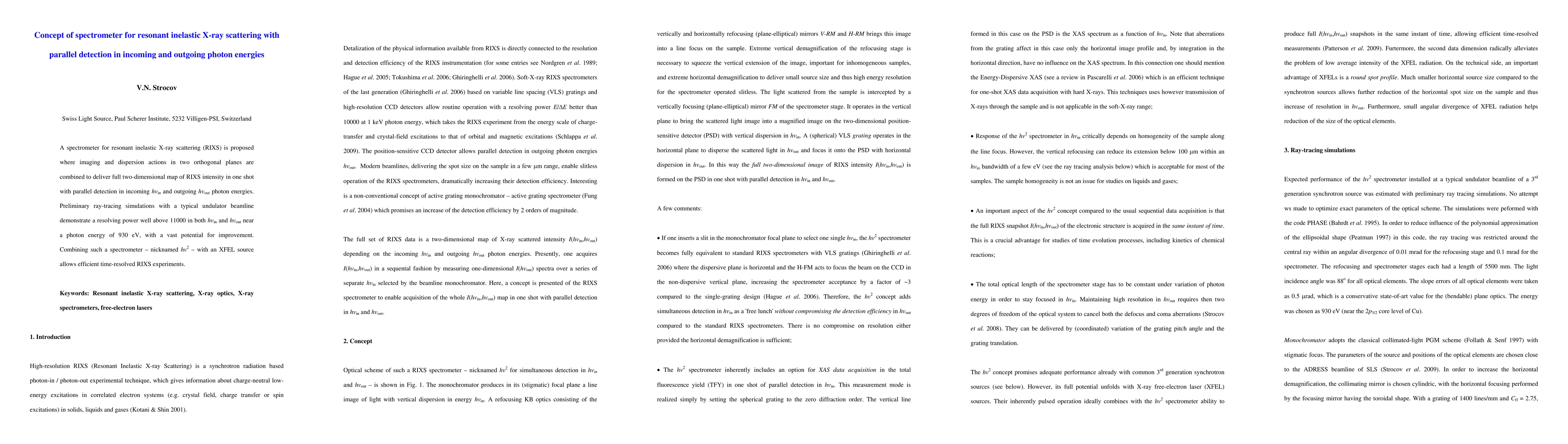 A spectrometer for resonant inelastic X-ray scattering (RIXS) is proposed where imaging and dispersion actions in two orthogonal planes are combined to deliver full two-dimensional map of RIXS intensity in one shot with parallel detection in incoming hvin and outgoing hvout photon energies. Preliminary ray-tracing simulations with a typical undulator beamline demonstrate a resolving power well above 11000 in both hvin and hvout near a photon energy of 930 eV, with a vast potential for improvement. Combining such a spectrometer - nicknamed hv2 - with an XFEL source allows efficient time-resolved RIXS experiments.