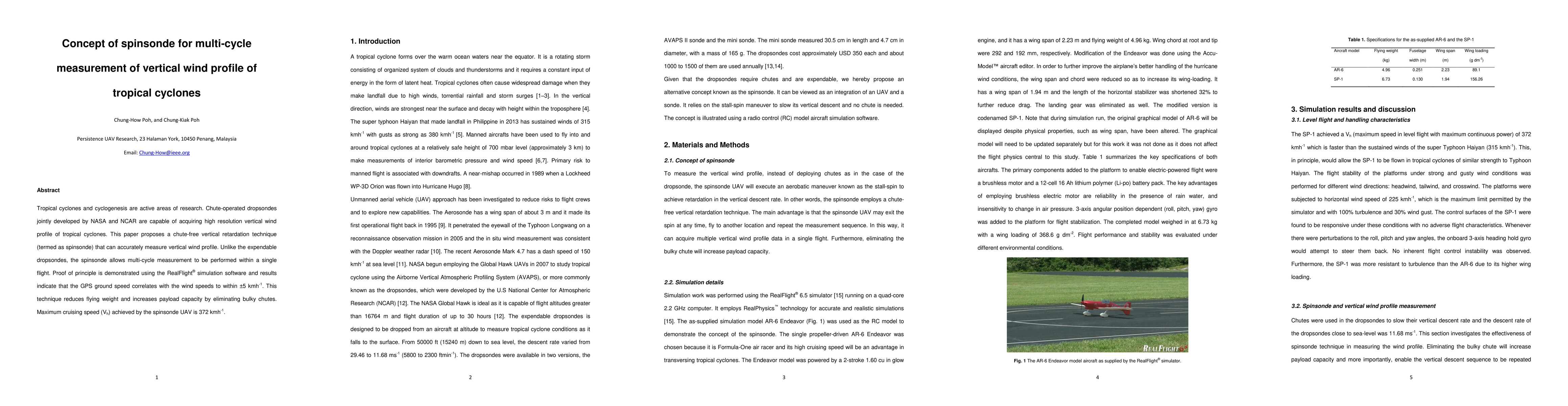 Tropical cyclones and cyclogenesis are active areas of research. Chute-operated dropsondes jointly developed by NASA and NCAR are capable of acquiring high resolution vertical wind profile of tropical cyclones. This paper proposes a chute-free vertical retardation technique (termed as spinsonde) that can accurately measure vertical wind profile. Unlike the expendable dropsondes, the spinsonde allows multi-cycle measurement to be performed within a single flight. Proof of principle is demonstrated using a simulation software and results indicate that the GPS ground speed correlates with the wind speeds to within +/-5 km/h. This technique reduces flying weight and increases payload capacity by eliminating bulky chutes. Maximum cruising speed (Vh) achieved by the spinsonde UAV is 372 km/h.