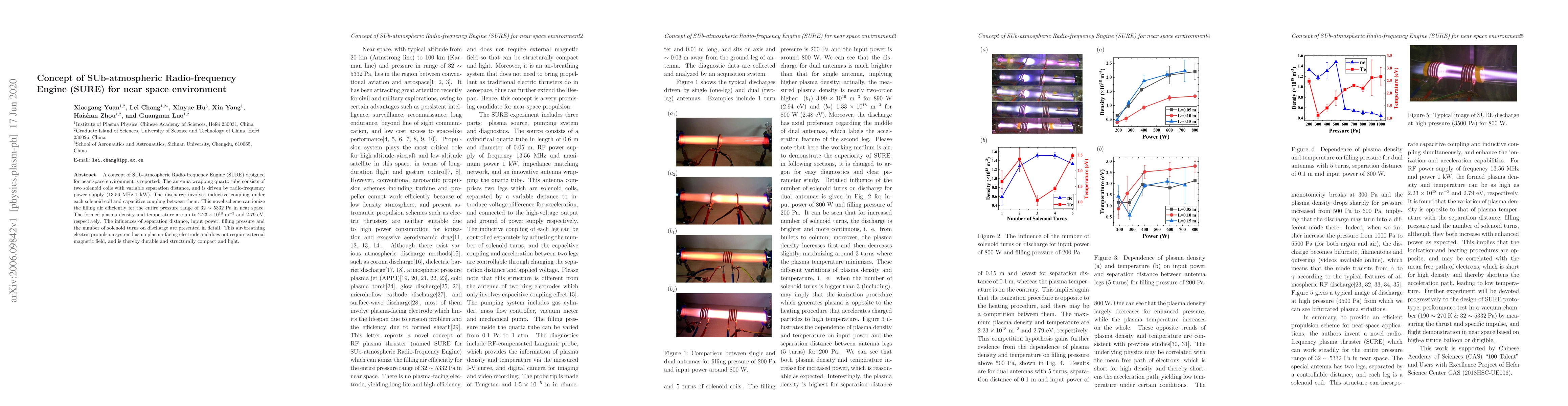 A concept of SUb-atmospheric Radio-frequency Engine (SURE) designed for near space environment is reported. The antenna wrapping quartz tube consists of two solenoid coils with variable separation distance, and is driven by radio-frequency power supply (13.56~MHz-1~kW). The discharge involves inductive coupling under each solenoid coil and capacitive coupling between them. This novel scheme can ionize the filling air efficiently for the entire pressure range of 32\sim 5332 Pa in near space. The formed plasma density and temperature are up to 2.23\times 10^{18}~m^{-3} and 2.79 eV, respectively. The influences of separation distance, input power, filling pressure and the number of solenoid turns on discharge are presented in detail. This air-breathing electric propulsion system has no plasma-facing electrode and does not require external magnetic field, and is thereby durable and structurally compact and light.