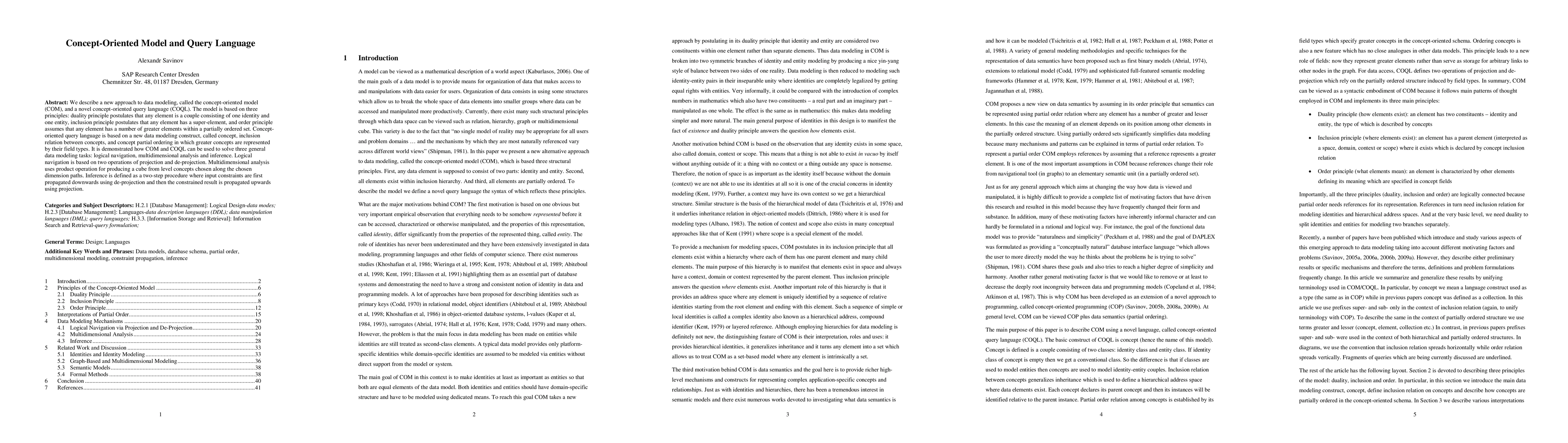 The paper introduces a concept-oriented model (COM) and a query language (COQL) based on principles of duality, inclusion, and order. COM and COQL facilitate logical navigation, multidimensional analysis, and inference through projection, de-projection, and cube production.