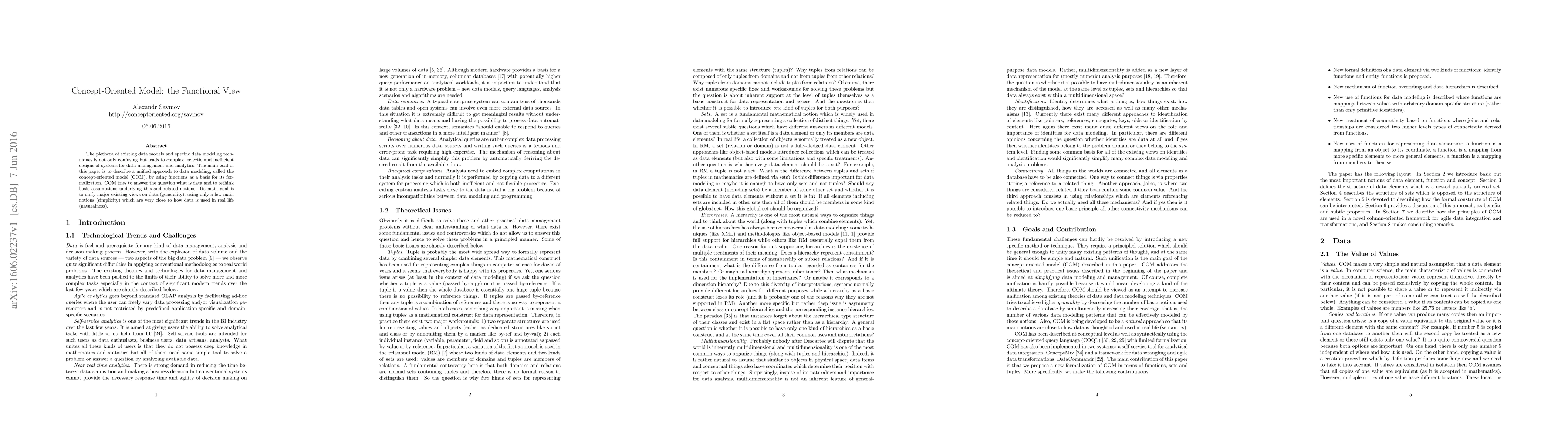 This paper proposes a unified data modeling approach called Concept-Oriented Model (COM), which uses functions as its basis for formalization, aiming to simplify and unify existing views on data management and analytics.