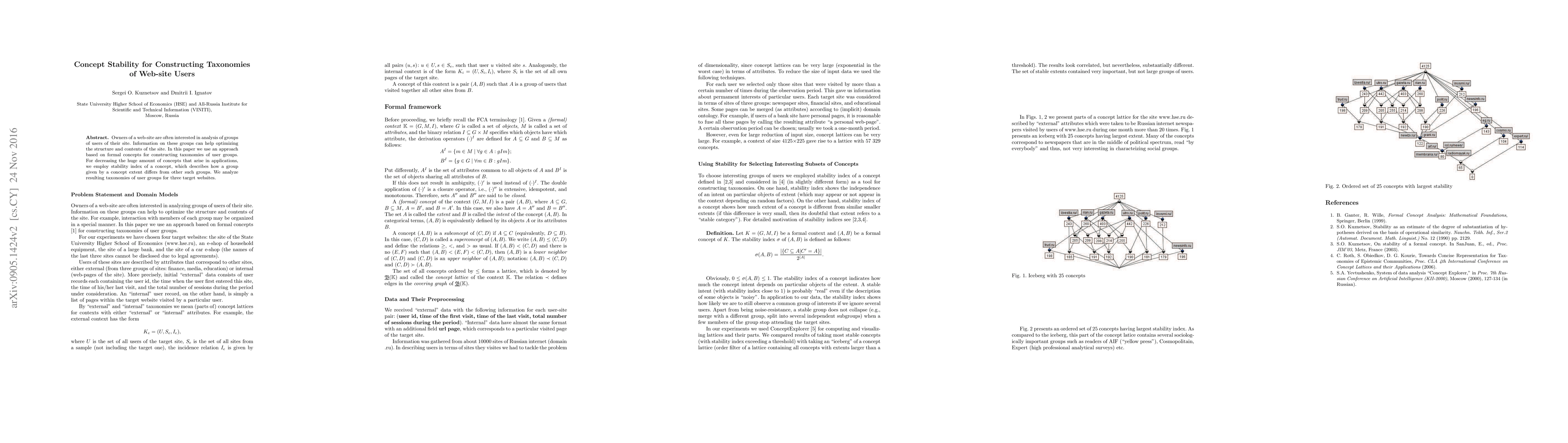 Researchers developed a method to analyze user groups on websites using formal concepts, focusing on stability index to reduce concept overload. They applied this approach to three target websites to identify key findings and implications for site optimization.
