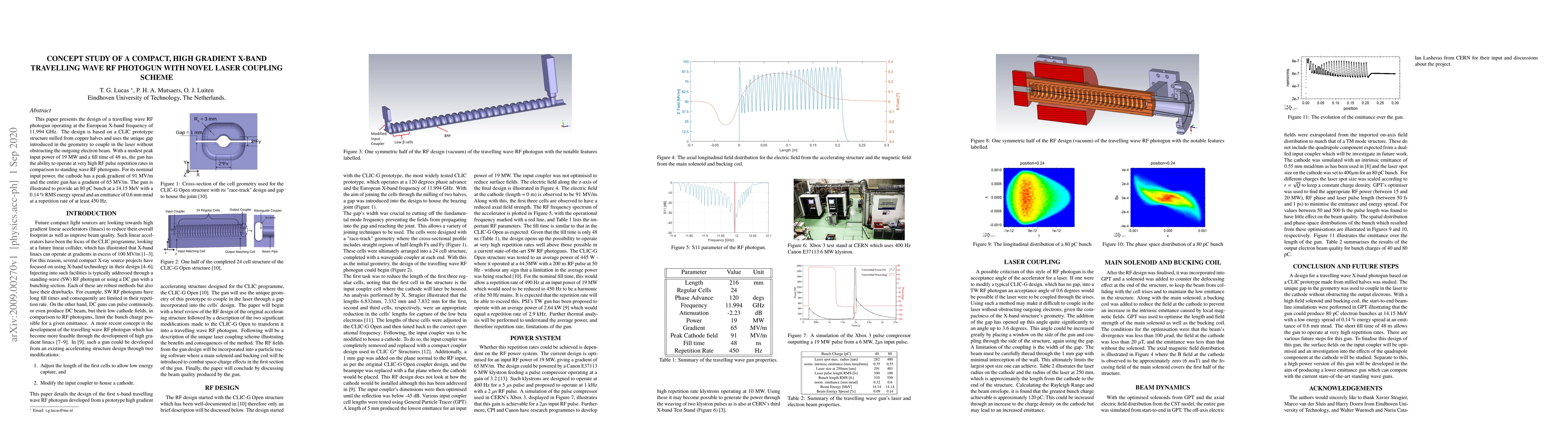 This paper details a compact, high-gradient X-band travelling wave RF photogun design that employs a novel laser coupling scheme to achieve high performance at 11.994 GHz, demonstrating a peak gradient of 91 MV/m and the ability to produce electron bunches with low emittance and energy spread.
