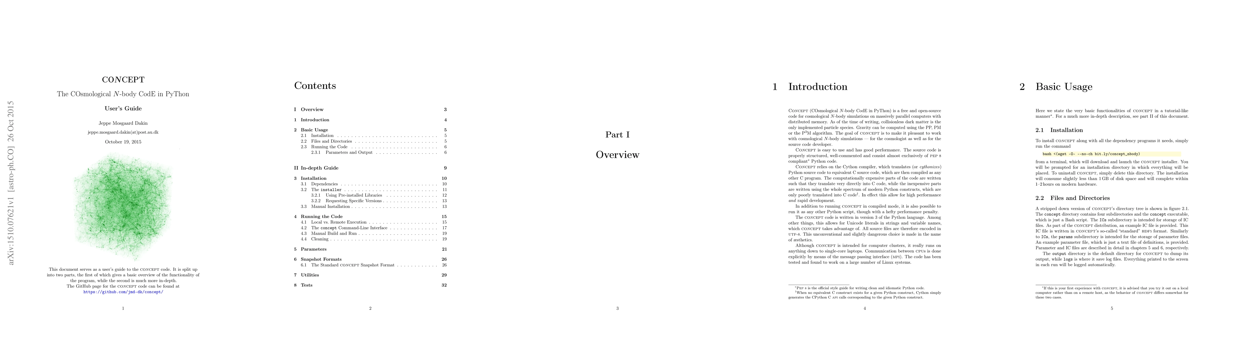 CO$N$CEPT (COsmological $N$-body CodE in PyThon) is a free and open-source code for cosmological $N$-body simulations on massively parallel computers with distributed memory. Collisionless dark matter is the only implemented particle species. Gravity can be computed using the PP, PM or the P$^{3}$M algorithm. The goal of CO$N$CEPT is to make it pleasant to work with cosmological $N$-body simulations - for the cosmologist as well as for the source code developer. This is the user guide. The source code and additional documentation can be found at https://github.com/jmd-dk/concept/