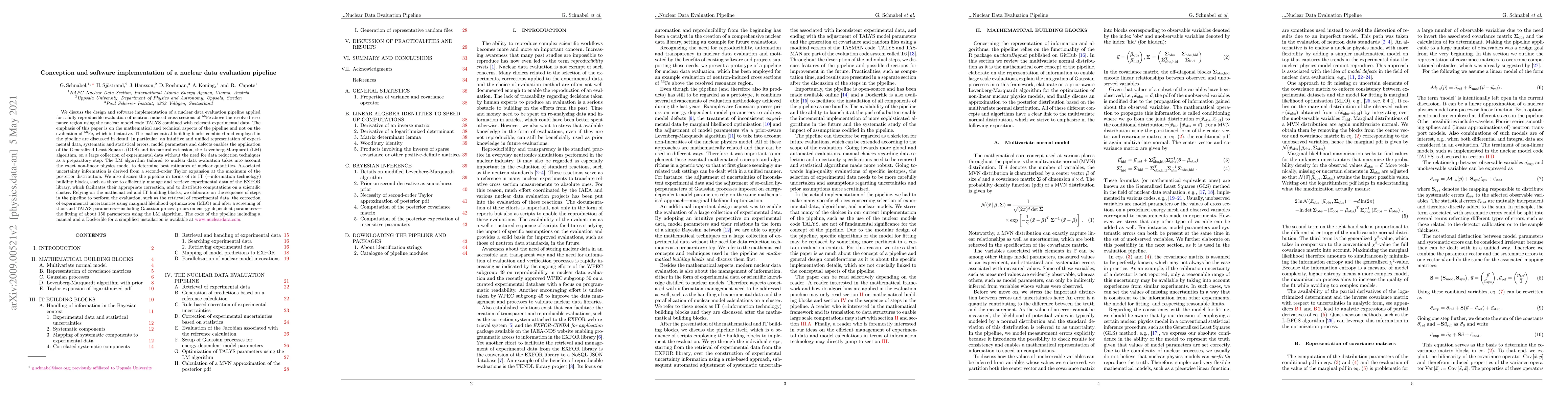 We discuss the design and software implementation of a nuclear data evaluation pipeline applied for a fully reproducible evaluation of neutron-induced cross sections of $^{56}$Fe above the resolved resonance region using the nuclear model code TALYS combined with relevant experimental data. The emphasis is on the mathematical and technical aspects of the pipeline and not on the evaluation of $^{56}$Fe, which is tentative. The mathematical building blocks combined and employed in the pipeline are discussed in detail. A unified representation of experimental data, systematic and statistical errors, model parameters and defects enables the application of the Generalized Least Squares (GLS) and its natural extension, the Levenberg-Marquardt (LM) algorithm, on a large collection of experimental data. The LM algorithm tailored to nuclear data evaluation accounts for the exact non-linear physics model to determine best estimates of nuclear quantities. Associated uncertainty information is derived from a Taylor expansion at the maximum of the posterior distribution. We also discuss the pipeline in terms of its IT (=information technology) building blocks, such as those to efficiently manage and retrieve experimental data of the EXFOR library and to distribute computations on a scientific cluster. Relying on the mathematical and IT building blocks, we elaborate on the sequence of steps in the pipeline to perform the evaluation, such as the retrieval of experimental data, the correction of experimental uncertainties using marginal likelihood optimization (MLO) and after a screening of thousand TALYS parameters -- including Gaussian process priors on energy dependent parameters -- the fitting of about 150 parameters using the LM algorithm. The code of the pipeline including a manual and a Dockerfile for a simplified installation is available at www.nucleardata.com.