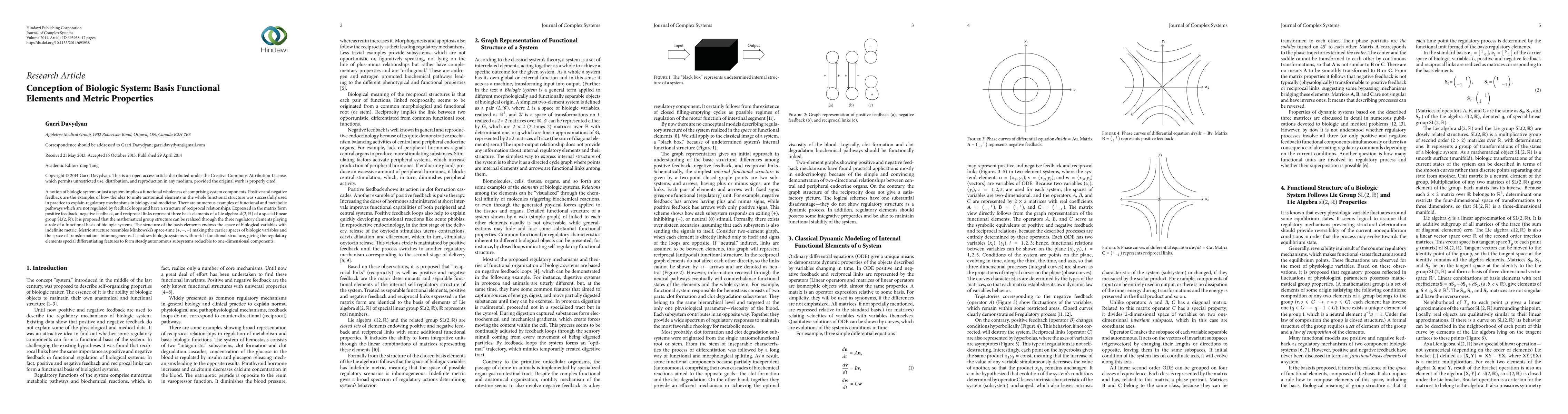 A notion of biologic system or just a system implies a functional wholeness of comprising system components. Positive and negative feedback are the examples of how the idea to unite anatomical elements in the whole functional structure was successfully used in practice to explain regulatory mechanisms in biology and medicine. There are numerous examples of functional and metabolic pathways which are not regulated by feedback loops and have a structure of reciprocal relationships. Expressed in the matrix form positive feedback, negative feedback, and reciprocal links represent three basis elements of a Lie algebra sl(2,R)of a special linear group SL(2,R). It is proposed that the mathematical group structure can be realized through the three regulatory elements playing a role of a functional basis of biologic systems. The structure of the basis elements endows the space of biological variables with indefinite metric. Metric structure resembles Minkowski's space-time (+, -, -) making the carrier spaces of biologic variables and the space of transformations inhomogeneous. It endows biologic systems with a rich functional structure, giving the regulatory elements special differentiating features to form steady autonomous subsystems reducible to one-dimensional components.