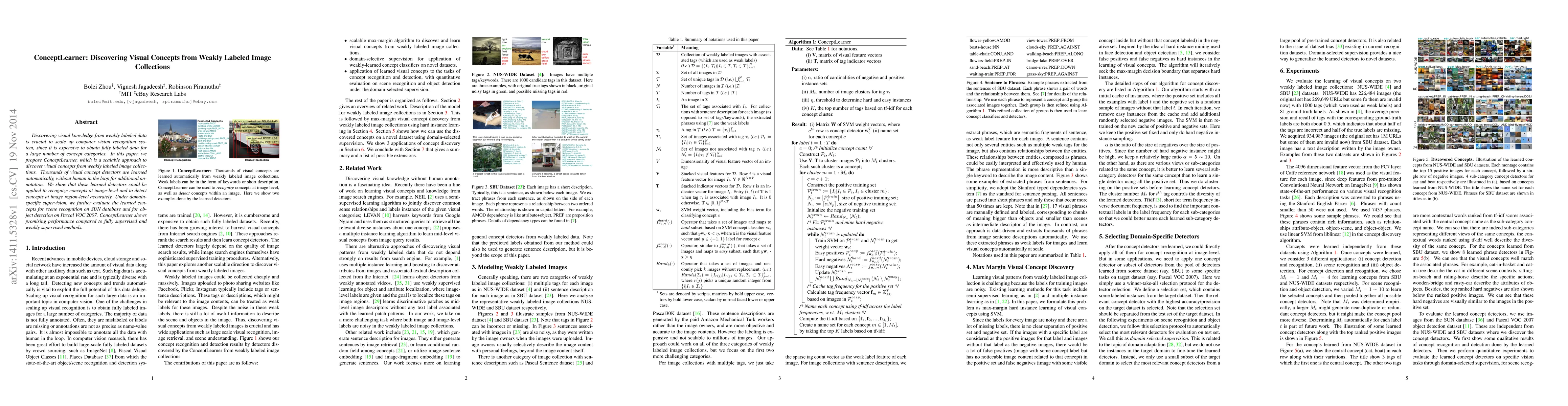 ConceptLearner is a scalable method for discovering visual concepts from weakly labeled image collections, automatically learning thousands of visual concept detectors without additional human annotation. It demonstrates effective concept recognition at both image and region levels, showing promising performance in scene recognition and object detection compared to fully and weakly supervised methods.