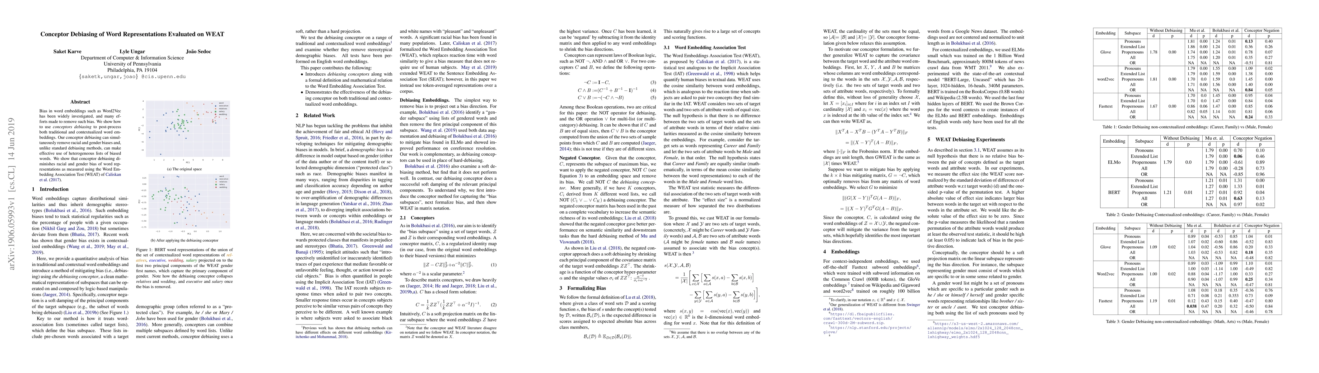 This paper proposes conceptor debiasing for word embeddings to remove racial and gender biases, demonstrating its effectiveness using the Word Embedding Association Test (WEAT). Unlike traditional methods, it leverages diverse lists of biased words and shows significant reduction in bias.