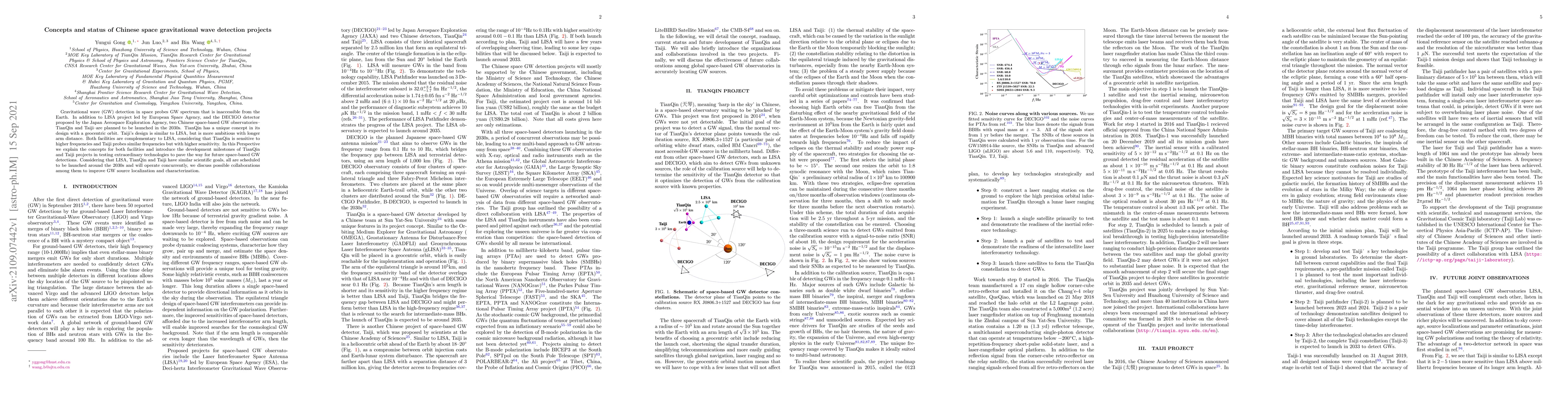 Gravitational wave (GW) detection in space probes GW spectrum that is inaccessible from the Earth. In addition to LISA project led by European Space Agency, and the DECIGO detector proposed by the Japan Aerospace Exploration Agency, two Chinese space-based GW observatories -- TianQin and Taiji -- are planned to be launched in the 2030s. TianQin has a unique concept in its design with a geocentric orbit. Taiji's design is similar to LISA, but is more ambitious with longer arm distance. Both facilities are complementary to LISA, considering that TianQin is sensitive to higher frequencies and Taiji probes similar frequencies but with higher sensitivity. In this Perspective we explain the concepts for both facilities and introduce the development milestones of TianQin and Taiji projects in testing extraordinary technologies to pave the way for future space-based GW detections. Considering that LISA, TianQin and Taiji have similar scientific goals, all are scheduled to be launched around the 2030s and will operate concurrently, we discuss possible collaborations among them to improve GW source localization and characterization.