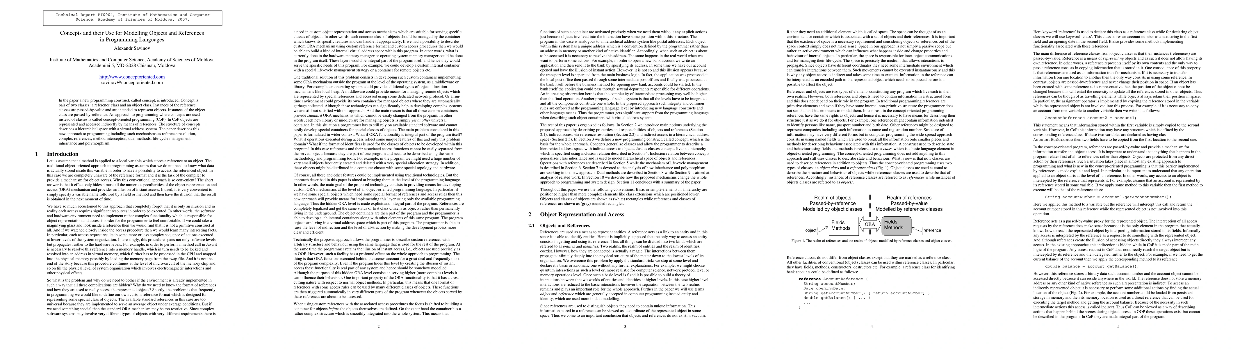 In the paper a new programming construct, called concept, is introduced. Concept is pair of two classes: a reference class and an object class. Instances of the reference classes are passed-by-value and are intended to represent objects. Instances of the object class are passed-by-reference. An approach to programming where concepts are used instead of classes is called concept-oriented programming (CoP). In CoP objects are represented and accessed indirectly by means of references. The structure of concepts describes a hierarchical space with a virtual address system. The paper describes this new approach to programming including such mechanisms as reference resolution, complex references, method interception, dual methods, life-cycle management inheritance and polymorphism.