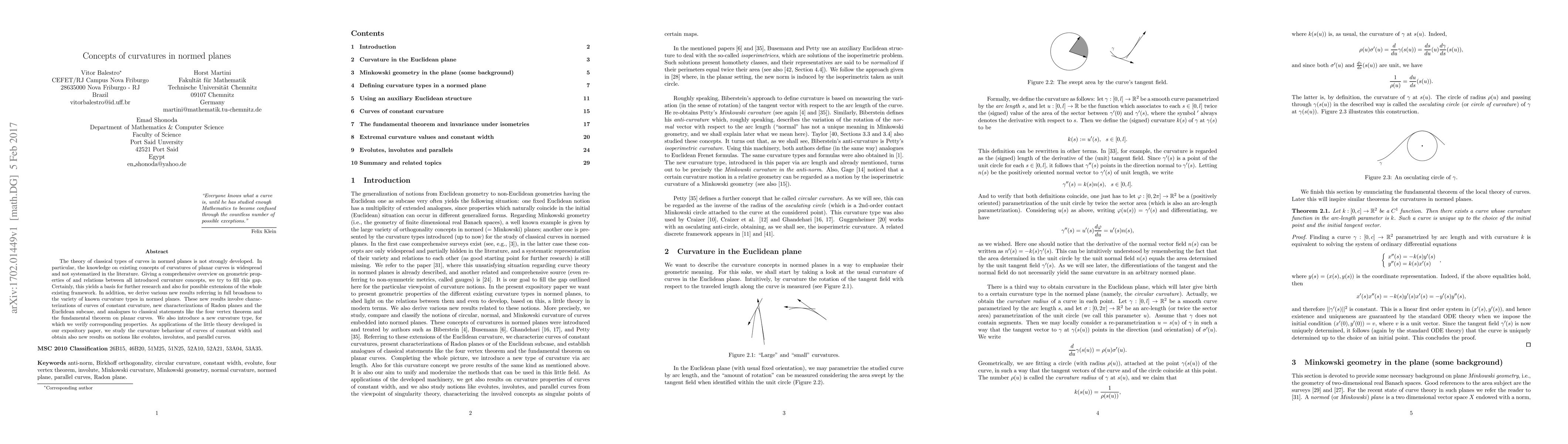 This paper provides a comprehensive overview of various curvature concepts in normed planes, systematically organizing existing knowledge and introducing new results. It also presents new curvature types and applications, including studies on curves of constant width, evolutes, involutes, and parallel curves.