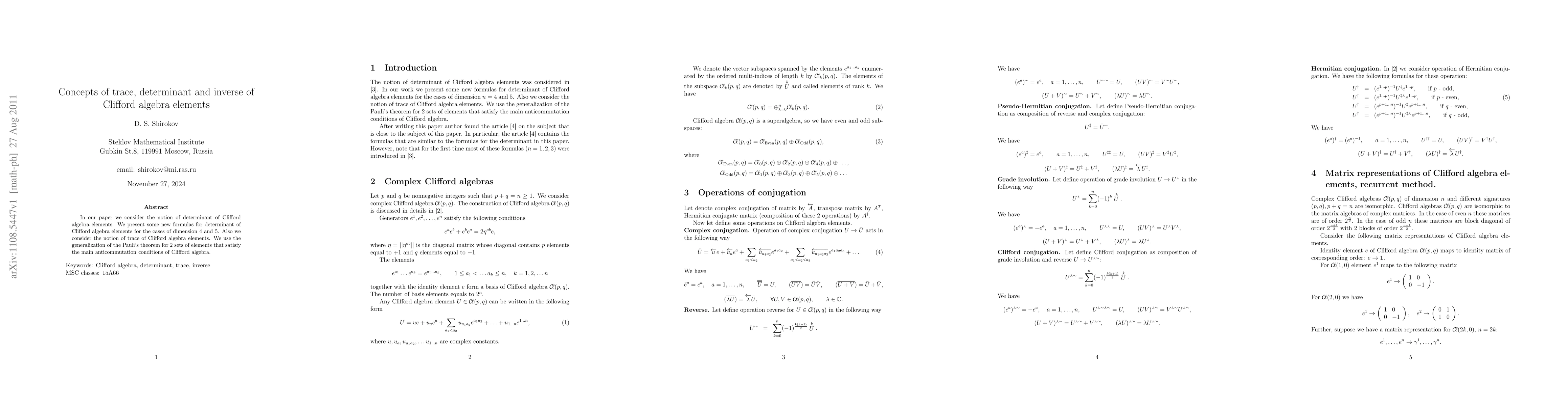 This paper introduces new formulas for the determinant and trace of elements in Clifford algebras of dimensions 4 and 5, utilizing a generalized version of Pauli's theorem for sets that adhere to Clifford algebra's anticommutation properties.