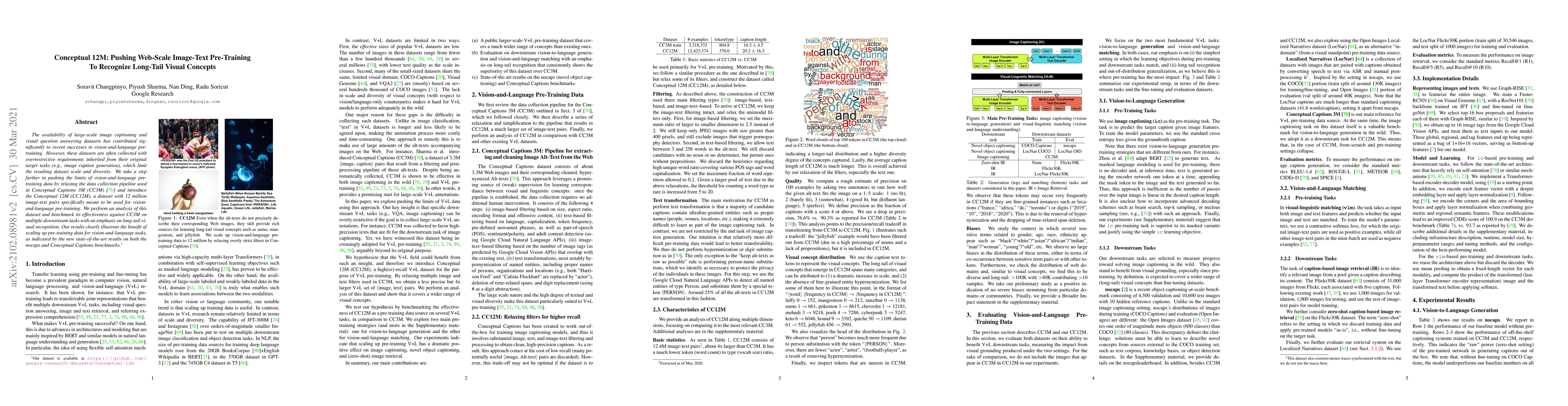 This paper introduces Conceptual 12M (CC12M), a dataset of 12 million image-text pairs designed to enhance vision-and-language pre-training, overcoming limitations of previous datasets. The study demonstrates its effectiveness over the smaller Conceptual Captions 3M (CC3M) dataset, achieving state-of-the-art results on long-tail visual recognition tasks.