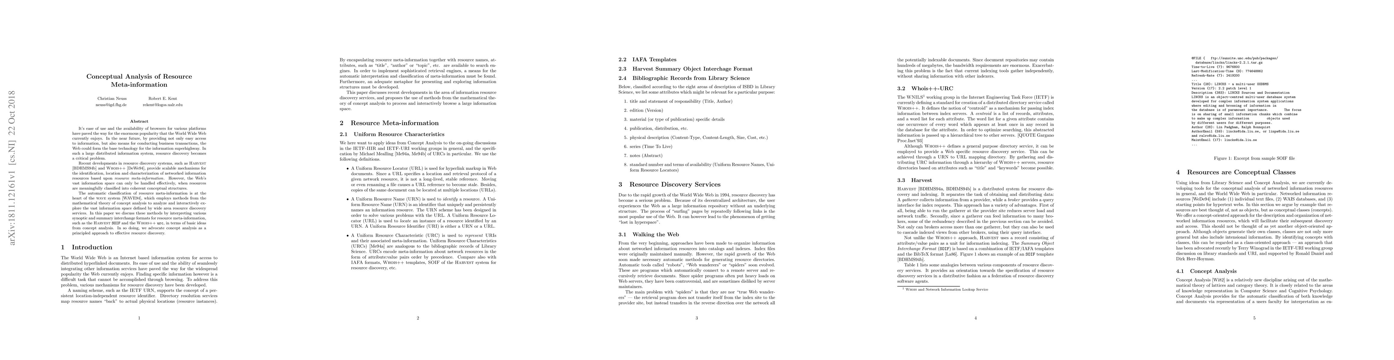 This paper explores the use of concept analysis to classify resource meta-information for effective resource discovery on the Web. It discusses the WAVE system's application of mathematical concept analysis to interpret formats like Harvest SOIF and Whois++ urc, advocating for this approach to enhance the organization and accessibility of vast distributed information.