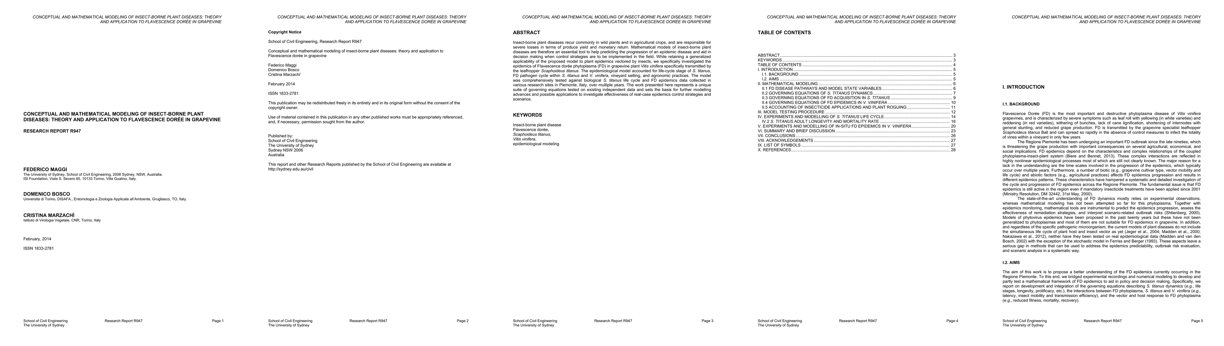 Insect-borne plant diseases recur commonly in wild plants and in agricultural crops, and are responsible for severe losses in terms of produce yield and monetary return. Mathematical models of insect-borne plant diseases are therefore an essential tool to help predicting the progression of an epidemic disease and aid in decision making when control strategies are to be implemented in the field. While retaining a generalized applicability of the proposed model to plant epidemics vectored by insects, we specifically investigated the epidemics of Flavescence dor\'ee phytoplasma (FD) in grapevine plant Vitis vinifera specifically transmitted by the leafhopper Scaphoideus titanus. The epidemiological model accounted for life-cycle stage of S. titanus, FD pathogen cycle within S. titanus and V. vinifera, vineyard setting, and agronomic practices. The model was comprehensively tested against biological S. titanus life cycle and FD epidemics data collected in various research sites in Piemonte, Italy, over multiple years. The work presented here represents a unique suite of governing equations tested on existing independent data and sets the basis for further modelling advances and possible applications to investigate effectiveness of real-case epidemics control strategies and scenarios.
