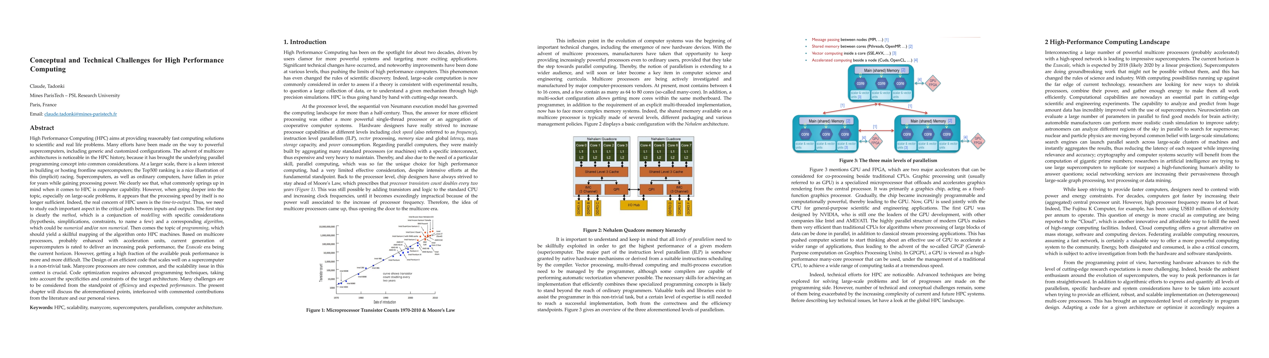 High Performance Computing (HPC) aims at providing reasonably fast computing solutions to scientific and real life problems. The advent of multicore architectures is noticeable in the HPC history, because it has brought the underlying parallel programming concept into common considerations. At a larger scale, there is a keen interest in building or hosting frontline supercomputers; the Top500 ranking is a nice illustration of this (implicit) racing. Supercomputers, as well as ordinary computers, have fallen in price for years while gaining processing power. We clearly see that, what commonly springs up in mind when it comes to HPC is computer capability. However, when going deeper into the topic, especially on large-scale problems, it appears that the processing speed by itself is no longer sufficient. Indeed, the real concern of HPC users is the time-to-output. Thus, we need to study each important aspect in the critical path between inputs and outputs. The first step is clearly the method, which is a conjunction of modelling with specific considerations (hypothesis, simplifications, constraints, to name a few) and a corresponding algorithm, which could be numerical and/or non numerical. Then comes the topic of programming, which should yield a skillful mapping of the algorithm onto HPC machines. Based on multicore processors, probably enhanced with acceleration units, current generation of supercomputers is rated to deliver an increasing peak performance, the Exascale era being the current horizon. However, getting a high fraction of the available peak performance is more and more difficult. The Design of an efficient code that scales well on a supercomputer is a non-trivial task. The present note will discuss the aforementioned points, interleaved with commented contributions from the literature and our personal views.
