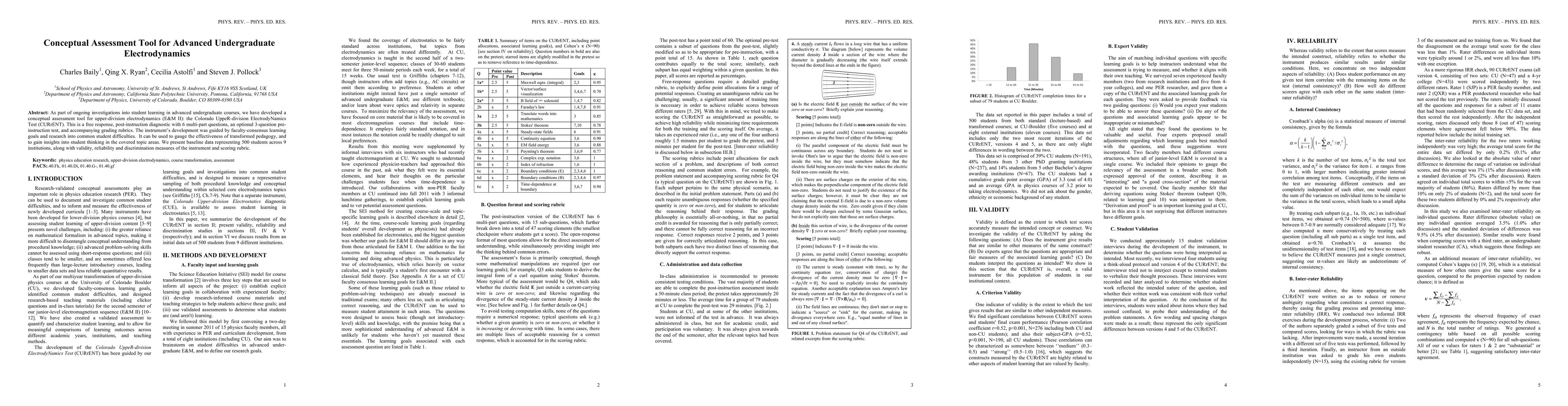 The CURrENT assessment tool was developed to evaluate student conceptual understanding in advanced electrodynamics, featuring 6 multi-part questions with a pre-test option and detailed rubrics; initial data from 500 students across 9 institutions demonstrate its validity, reliability, and effectiveness in gauging student learning.