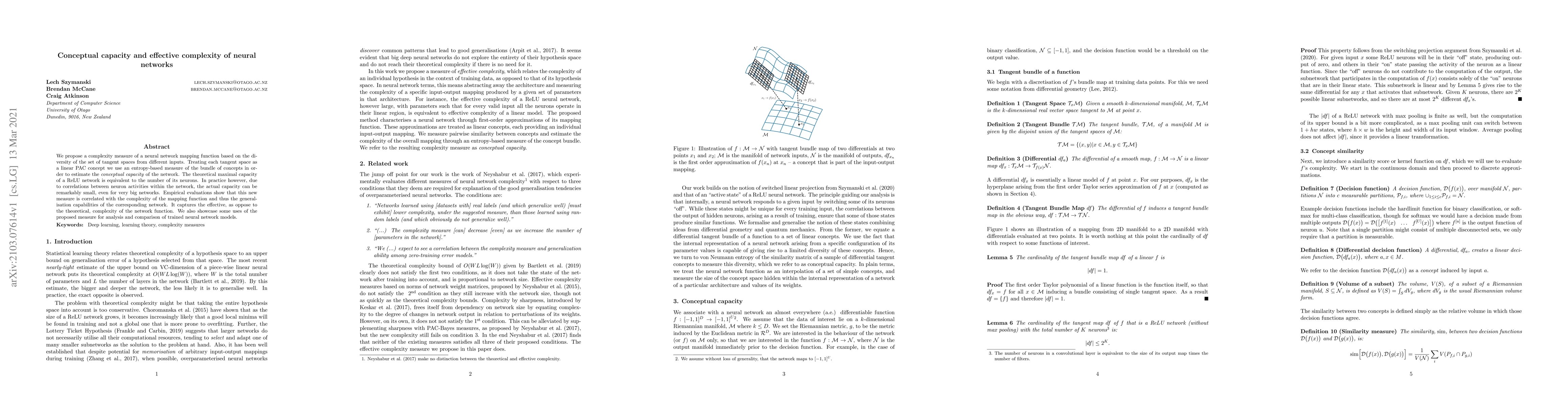 We propose a complexity measure of a neural network mapping function based on the diversity of the set of tangent spaces from different inputs. Treating each tangent space as a linear PAC concept we use an entropy-based measure of the bundle of concepts in order to estimate the conceptual capacity of the network. The theoretical maximal capacity of a ReLU network is equivalent to the number of its neurons. In practice however, due to correlations between neuron activities within the network, the actual capacity can be remarkably small, even for very big networks. Empirical evaluations show that this new measure is correlated with the complexity of the mapping function and thus the generalisation capabilities of the corresponding network. It captures the effective, as oppose to the theoretical, complexity of the network function. We also showcase some uses of the proposed measure for analysis and comparison of trained neural network models.