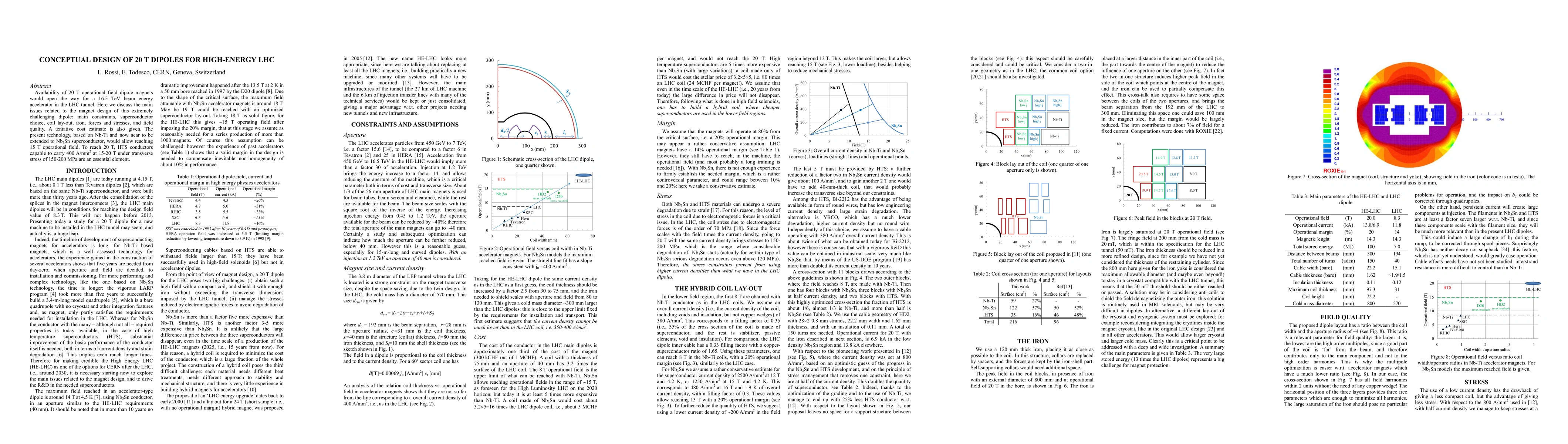 This paper discusses the conceptual design of 20 T dipole magnets for a 16.5 TeV beam energy accelerator in the LHC, focusing on main constraints, superconductor choice, coil layout, iron, forces, stresses, and field quality. High-temperature superconductors (HTS) capable of carrying 400 A/mm² at 15-20 T under significant stress are essential to achieve the desired field strength.