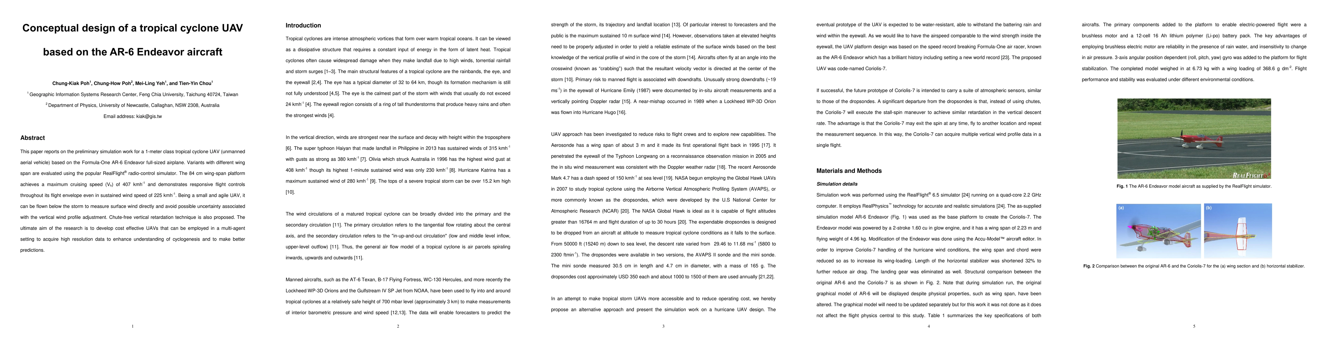 This paper reports on the preliminary simulation work for a 1-meter class tropical cyclone UAV (unmanned aerial vehicle) based on the Formula-One AR-6 Endeavor full-sized airplane. Variants with different wing span are evaluated using the popular RealFlight radio-control simulator. The 84 cm wing-span platform achieves a maximum cruising speed (Vh) of 407 kmh-1 and demonstrates responsive flight controls throughout its flight envelope even in sustained wind speed of 225 kmh-1. Being a small and agile UAV, it can be flown below the storm to measure surface wind directly and avoid possible uncertainty associated with the vertical wind profile adjustment. Chute-free vertical retardation technique is also proposed. The ultimate aim of the research is to develop cost effective UAVs that can be employed in a multi-agent setting to acquire high resolution data to enhance understanding of cyclogenesis and to make better predictions.