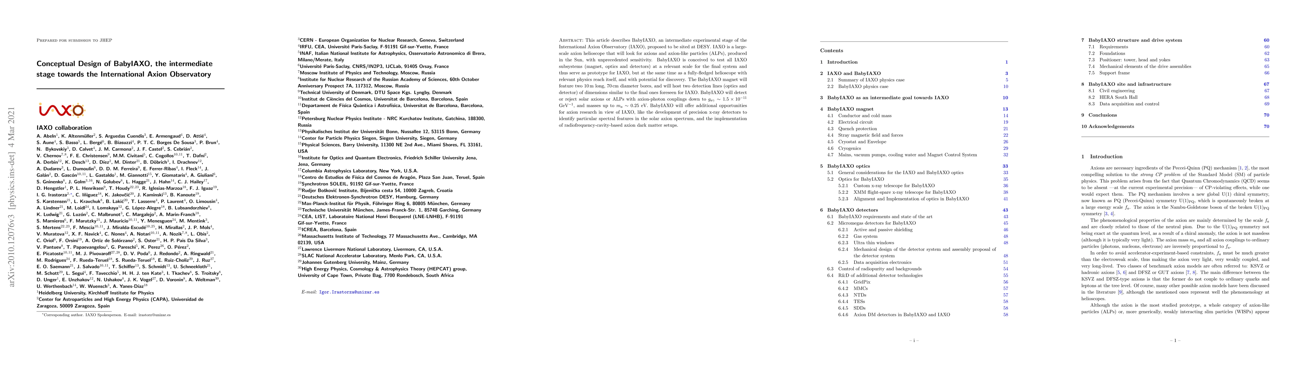 This paper outlines BabyIAXO, an intermediate prototype for the International Axion Observatory (IAXO) designed to test IAXO subsystems and serve as a fully-fledged helioscope capable of detecting solar axions or axion-like particles with significant sensitivity. BabyIAXO aims to achieve axion-photon coupling detection down to $g_{a\gamma} \sim 1.5 \times 10^{-11}$ GeV$^{-1}$ and axion masses up to $m_a\sim 0.25$ eV.