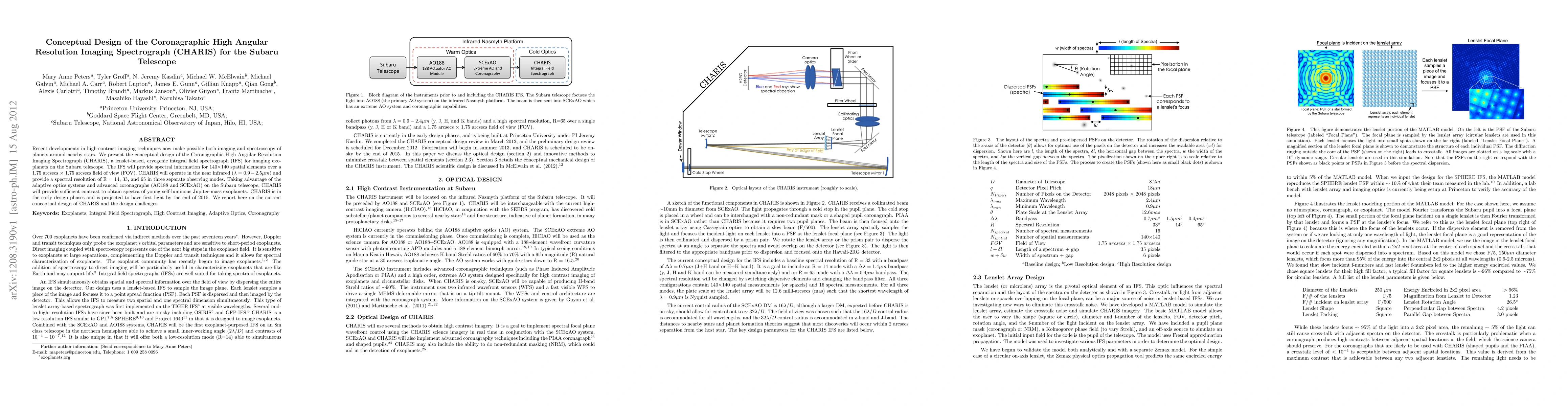 The paper presents the conceptual design of CHARIS, a cryogenic lenslet-based integral field spectrograph for the Subaru Telescope, aimed at imaging and spectroscopy of exoplanets in the near infrared. CHARIS will provide high-resolution spectral data over a 1.75 arcsecs FOV and is expected to achieve first light by the end of 2015.