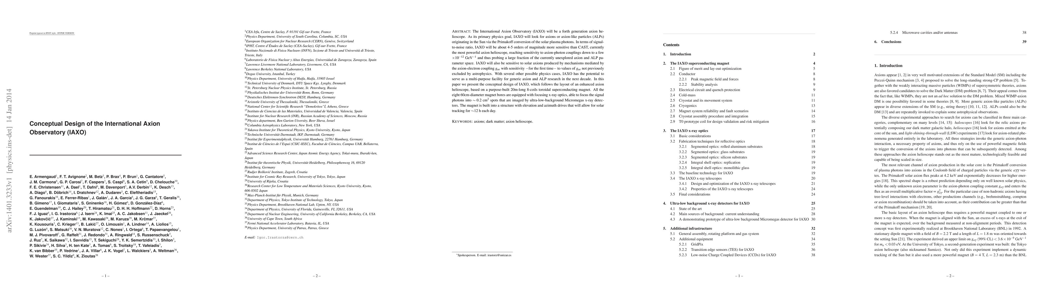 The International Axion Observatory (IAXO) aims to detect axions or axion-like particles from the Sun via the Primakoff conversion of solar plasma photons, with a sensitivity 4-5 orders of magnitude greater than current helioscopes. The design includes an 8-coil toroidal superconducting magnet and ultra-low-background x-ray detectors to explore new axion-photon coupling regions.