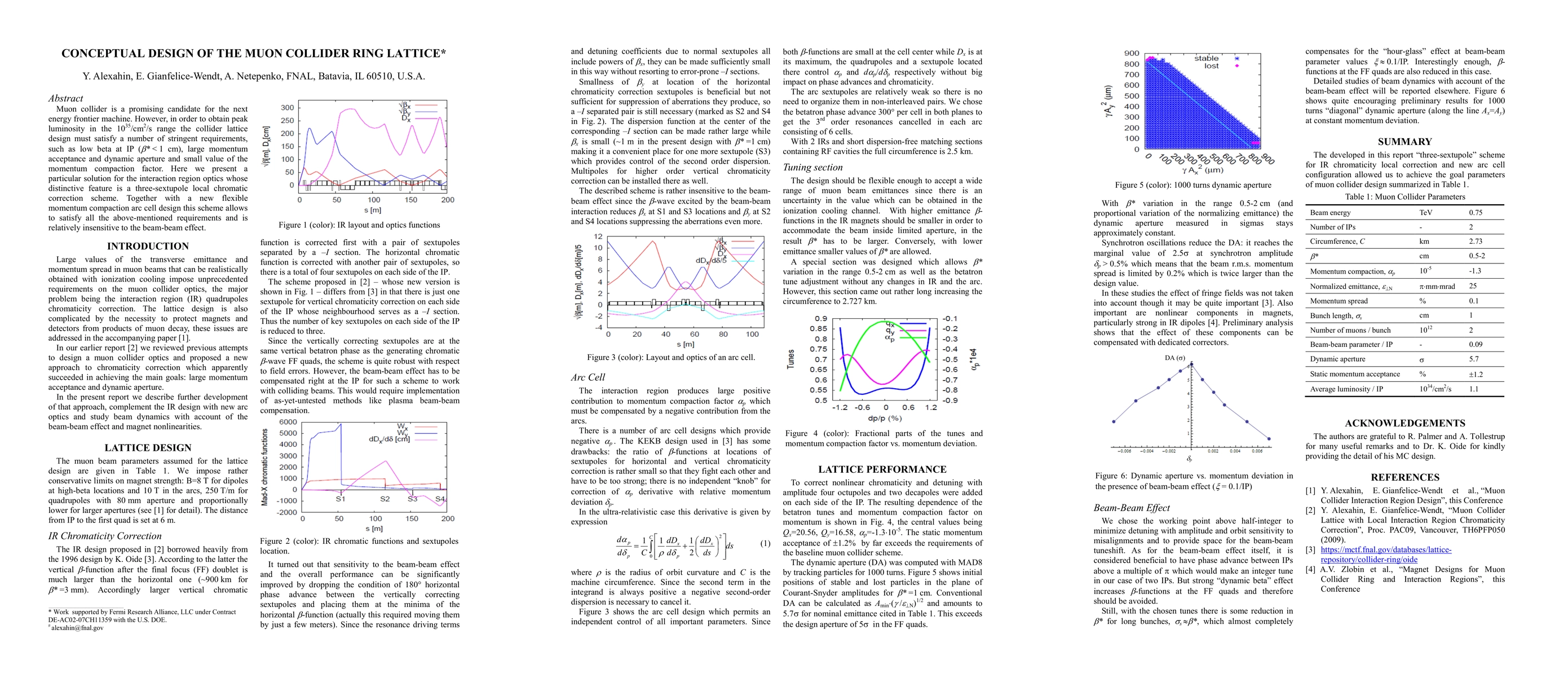 Muon collider is a promising candidate for the next energy frontier machine. However, in order to obtain peak luminosity in the 1035/cm2/s range the collider lattice design must satisfy a number of stringent requirements, such as low beta at IP ({\beta}* < 1 cm), large momentum acceptance and dynamic aperture and small value of the momentum compaction factor. Here we present a particular solution for the interaction region optics whose distinctive feature is a three-sextupole local chromatic correction scheme. Together with a new flexible momentum compaction arc cell design this scheme allows to satisfy all the above-mentioned requirements and is relatively insensitive to the beam-beam effect.