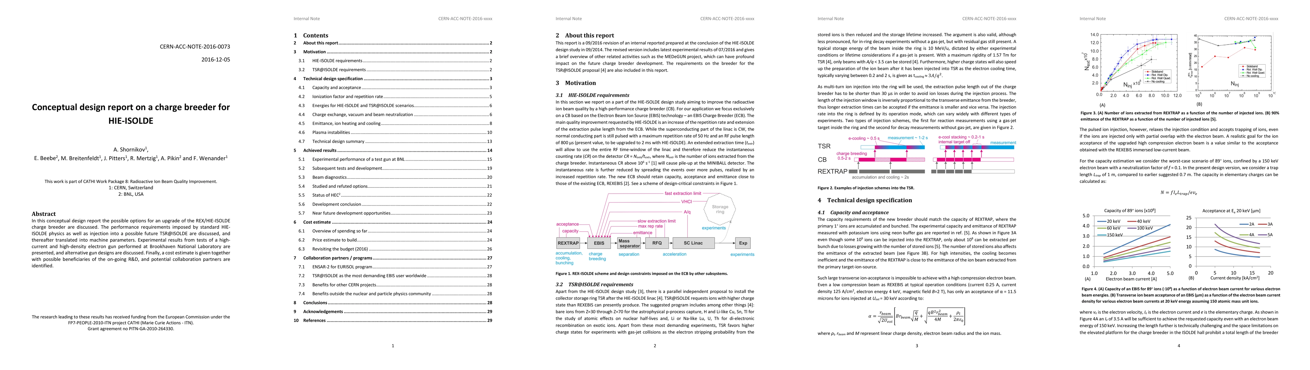 This report outlines conceptual designs for upgrading the REX/HIE-ISOLDE charge breeder, considering performance needs and future TSR@ISOLDE integration, and presents test results from a high-current electron gun. It also estimates costs and identifies potential R&D beneficiaries and collaboration partners.
