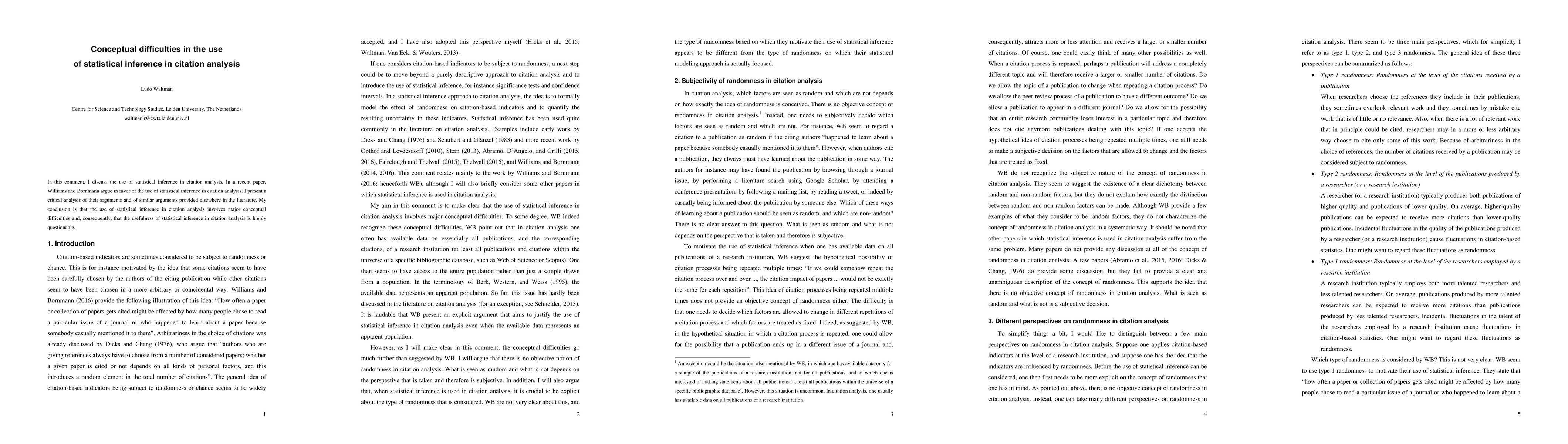 The paper critiques the use of statistical inference in citation analysis, concluding that it involves significant conceptual difficulties and raises questions about its usefulness.