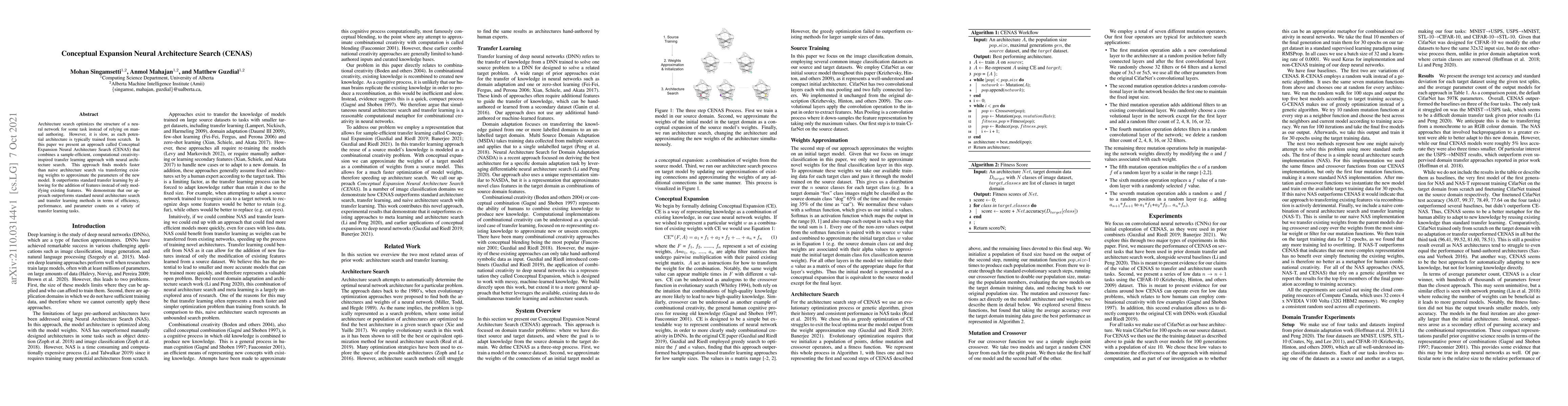 The paper introduces Conceptual Expansion Neural Architecture Search (CENAS), which accelerates neural architecture search by leveraging transfer learning and computational creativity to transfer existing weights and add new features, achieving better efficiency, performance, and fewer parameters than standard methods.