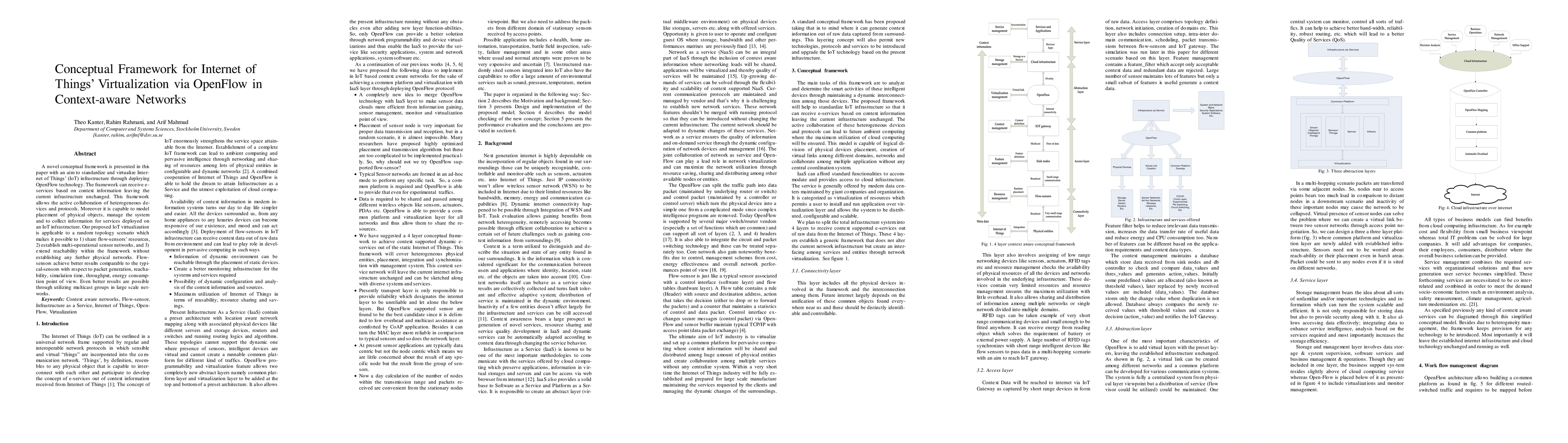 This paper proposes a novel conceptual framework to standardize and virtualize IoT infrastructure using OpenFlow technology, enabling context-aware networks and the collaboration of heterogeneous devices without altering existing infrastructure. The framework enhances resource sharing, multioperational sensor networks, and reachability through flow sensors, achieving better performance metrics.
