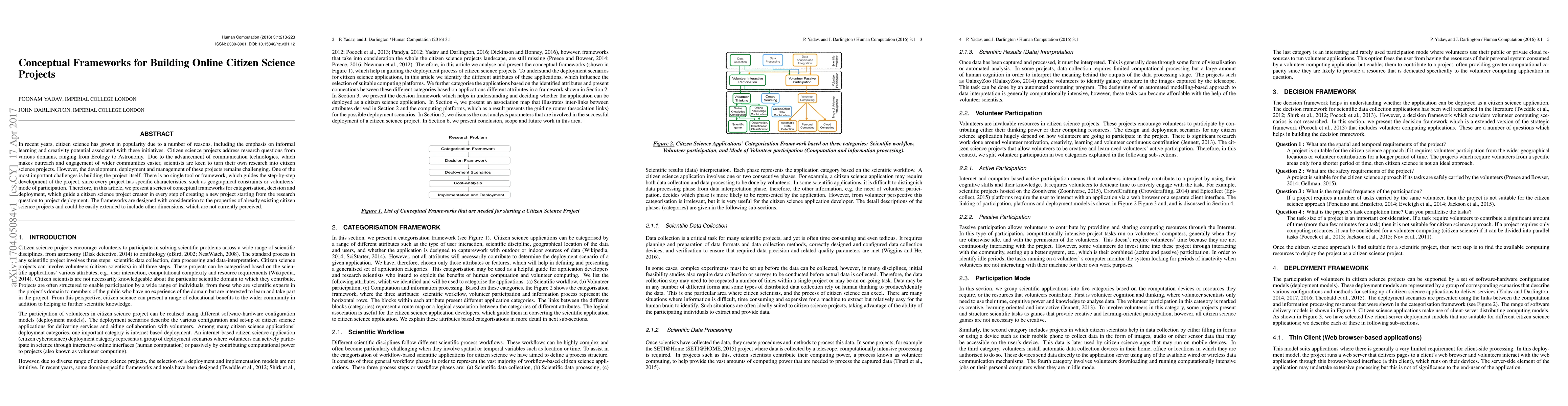 This paper presents conceptual frameworks to guide the development of online citizen science projects, addressing the challenges of project creation, deployment, and management. The frameworks are designed to accommodate the unique characteristics of each project and can be extended to include additional dimensions.
