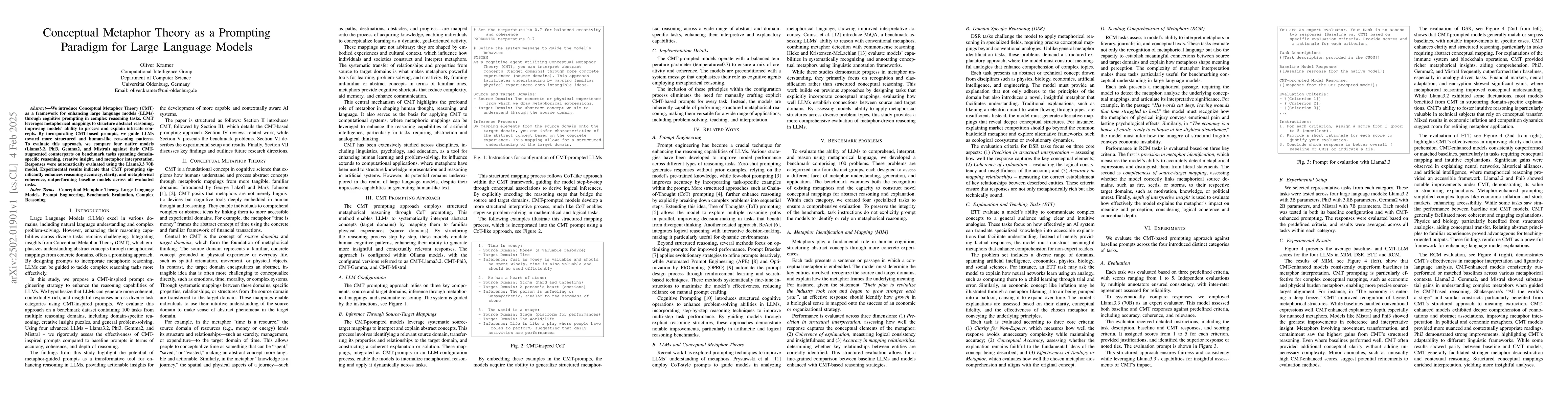 The research introduces Conceptual Metaphor Theory (CMT) as a framework for enhancing large language models (LLMs) through cognitive prompting in complex reasoning tasks. It leverages metaphorical mappings to structure abstract reasoning, improving models' ability to process and explain intricate concepts.