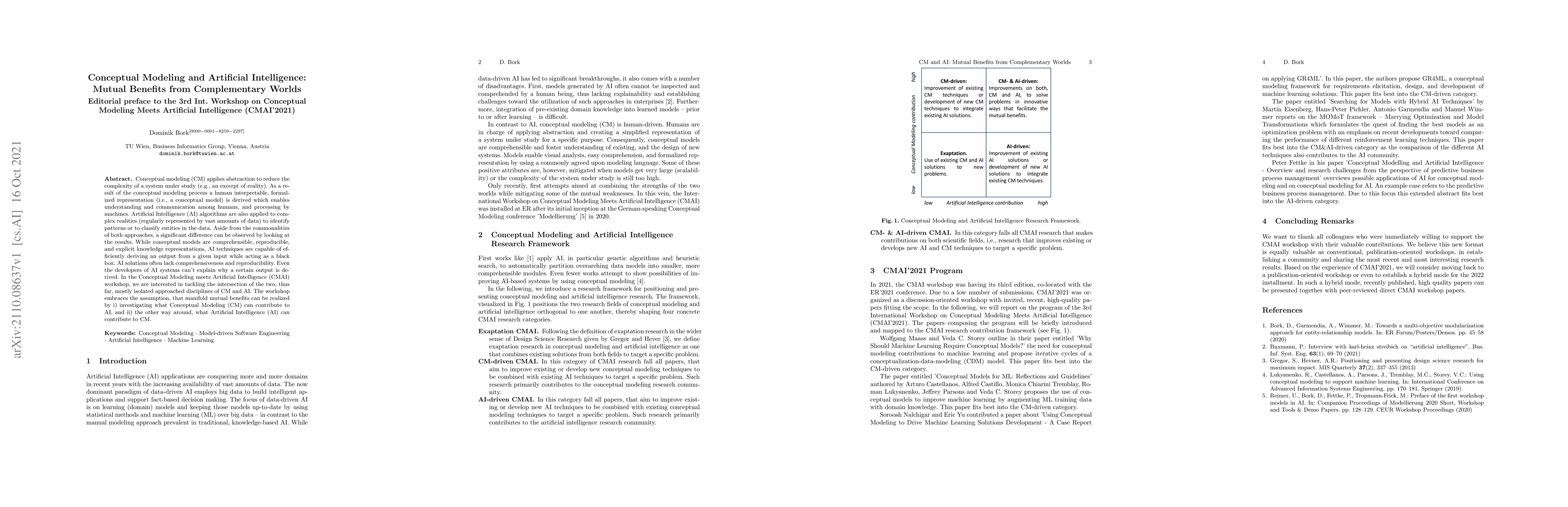 Conceptual modeling (CM) applies abstraction to reduce the complexity of a system under study (e.g., an excerpt of reality). As a result of the conceptual modeling process a human interpretable, formalized representation (i.e., a conceptual model) is derived which enables understanding and communication among humans, and processing by machines. Artificial Intelligence (AI) algorithms are also applied to complex realities (regularly represented by vast amounts of data) to identify patterns or to classify entities in the data. Aside from the commonalities of both approaches, a significant difference can be observed by looking at the results. While conceptual models are comprehensible, reproducible, and explicit knowledge representations, AI techniques are capable of efficiently deriving an output from a given input while acting as a black box. AI solutions often lack comprehensiveness and reproducibility. Even the developers of AI systems can't explain why a certain output is derived. In the Conceptual Modeling meets Artificial Intelligence (CMAI) workshop, we are interested in tackling the intersection of the two, thus far, mostly isolated approached disciplines of CM and AI. The workshop embraces the assumption, that manifold mutual benefits can be realized by i) investigating what Conceptual Modeling (CM) can contribute to AI, and ii) the other way around, what Artificial Intelligence (AI) can contribute to CM.