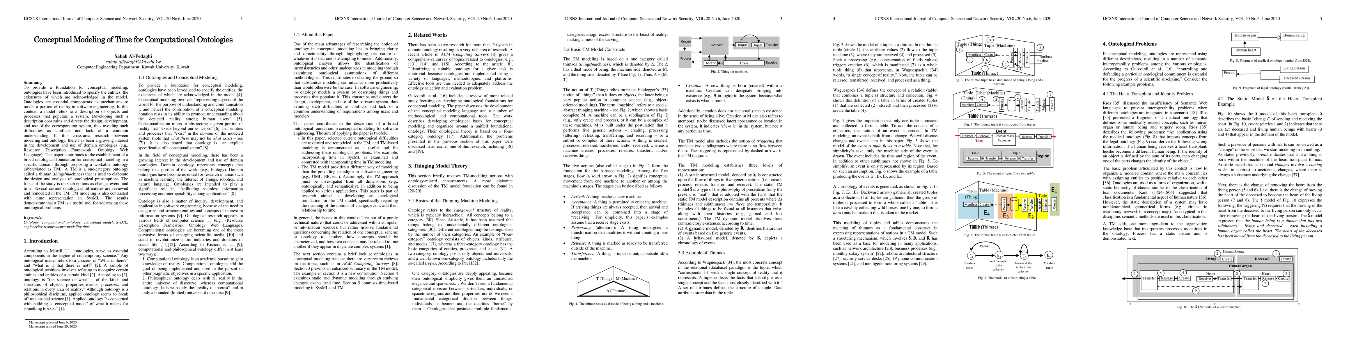 This paper proposes a conceptual modeling ontology (TM) for elaborating design and analysis of ontological presumptions, focusing on notions like change, event, and time. It contrasts TM modeling with SysML's time representation and shows TM's effectiveness in resolving current ontological challenges.