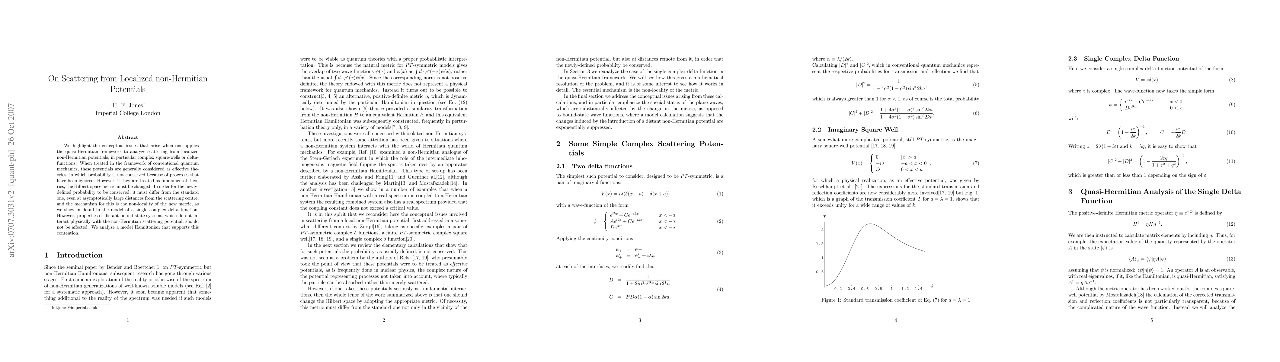 This paper discusses conceptual issues in scattering from localized non-Hermitian potentials, particularly complex square-wells or delta-functions, when analyzed using the quasi-Hermitian framework. It highlights that treating these potentials as fundamental theories requires a change in the Hilbert-space metric to conserve probability, which is non-local and affects distant bound-state systems minimally.
